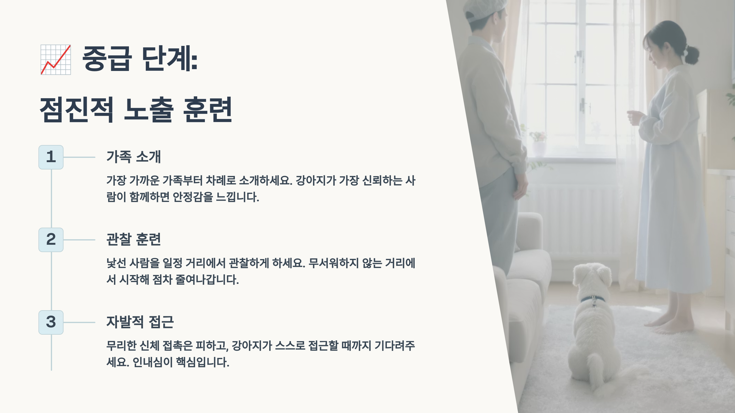 기초 훈련이 어느 정도 완성되면 이제 실제 상황에 점진적으로 노출시키는 중급 단계로 넘어가요. 이 단계에서는 통제된 환경에서 낯선 자극들을 체계적으로 경험하게 하는 것이 목표예요. 가장 중요한 원칙은 '천천히, 그리고 긍정적으로'예요.