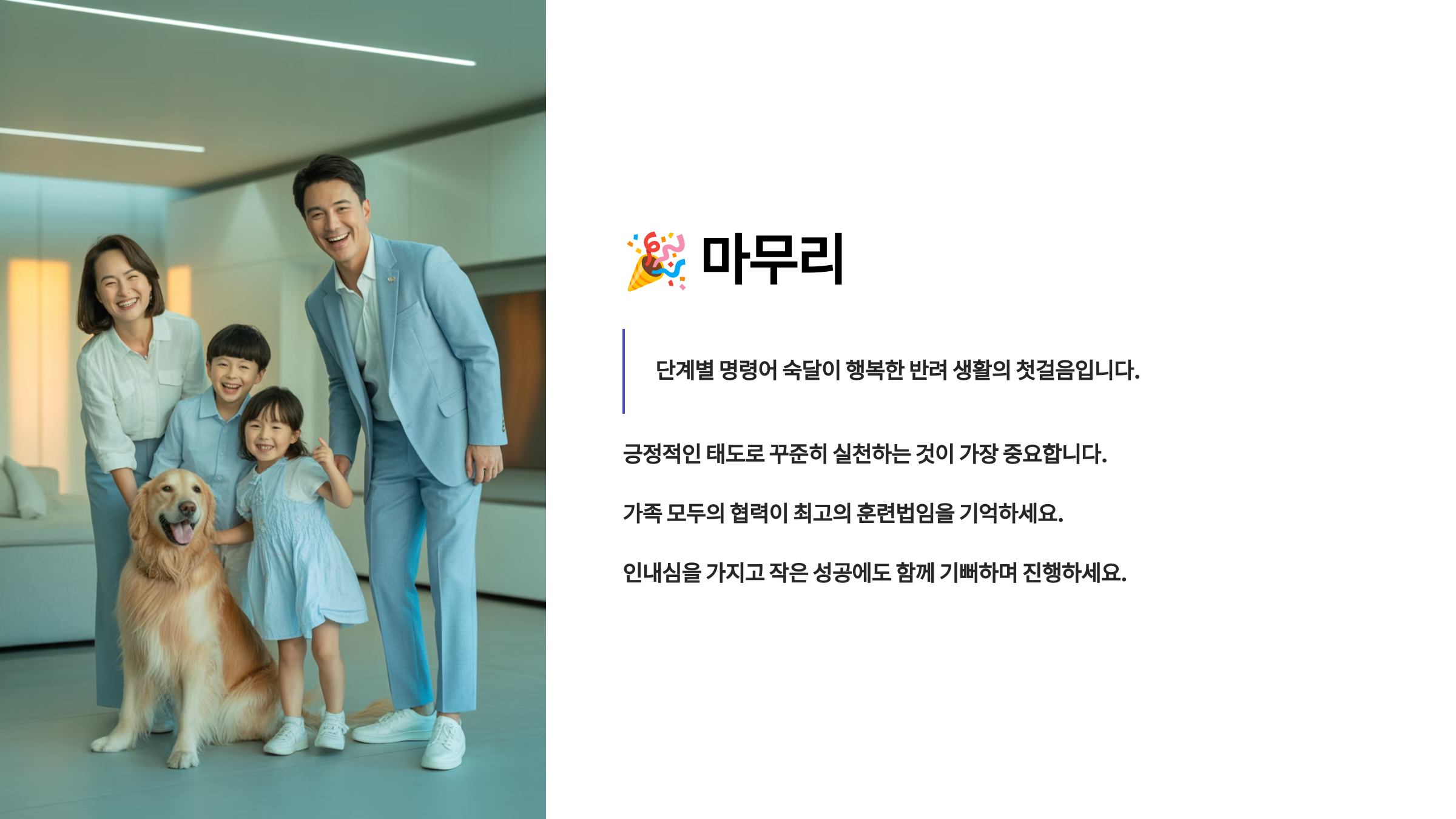 오늘 배운 내용을 바탕으로 우리 강아지와 함께 즐거운 훈련 시간을 가져보세요. 작은 성공이라도 함께 기뻐하고, 실패해도 다시 도전하는 긍정적인 마음가짐이 중요해요. 여러분과 강아지 모두에게 행복하고 보람찬 훈련 여정이 되기를 진심으로 응원합니다! 🐾💕
