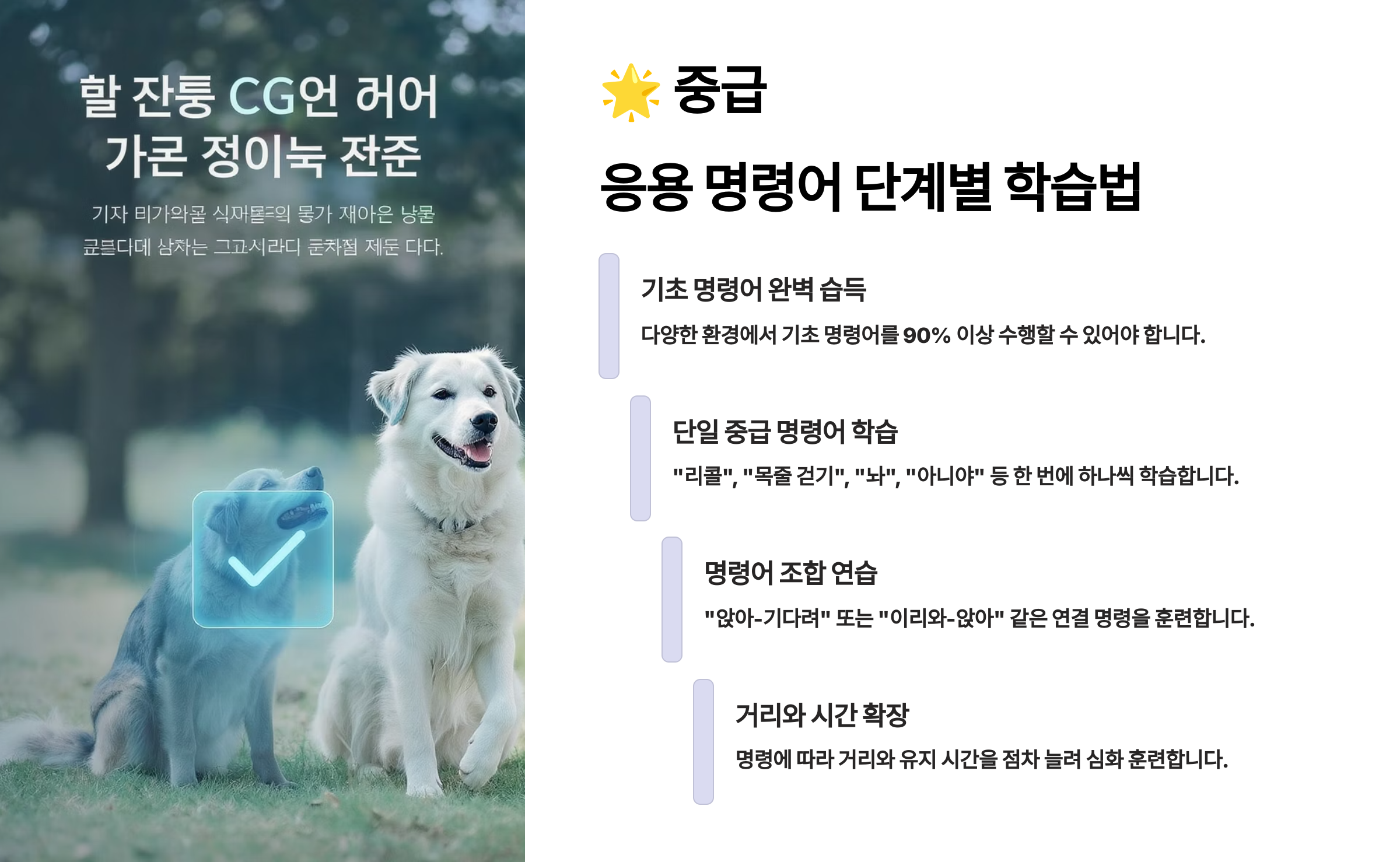 기초 명령어를 마스터했다면 이제 중급 응용 명령어에 도전할 차례예요! 중급 명령어는 일상생활을 더욱 편리하게 만들고, 강아지의 지능을 자극하여 정신적 만족감을 주는 훈련이랍니다. '돌아', '뒤로', '옆으로', '물어와', '놔', '조용히' 같은 명령어들은 산책이나 놀이 시간을 더욱 안전하고 즐겁게 만들어줘요. 각 명령어는 기초 명령어를 조합하거나 확장한 것이므로, 기초가 탄탄해야 쉽게 배울 수 있어요.