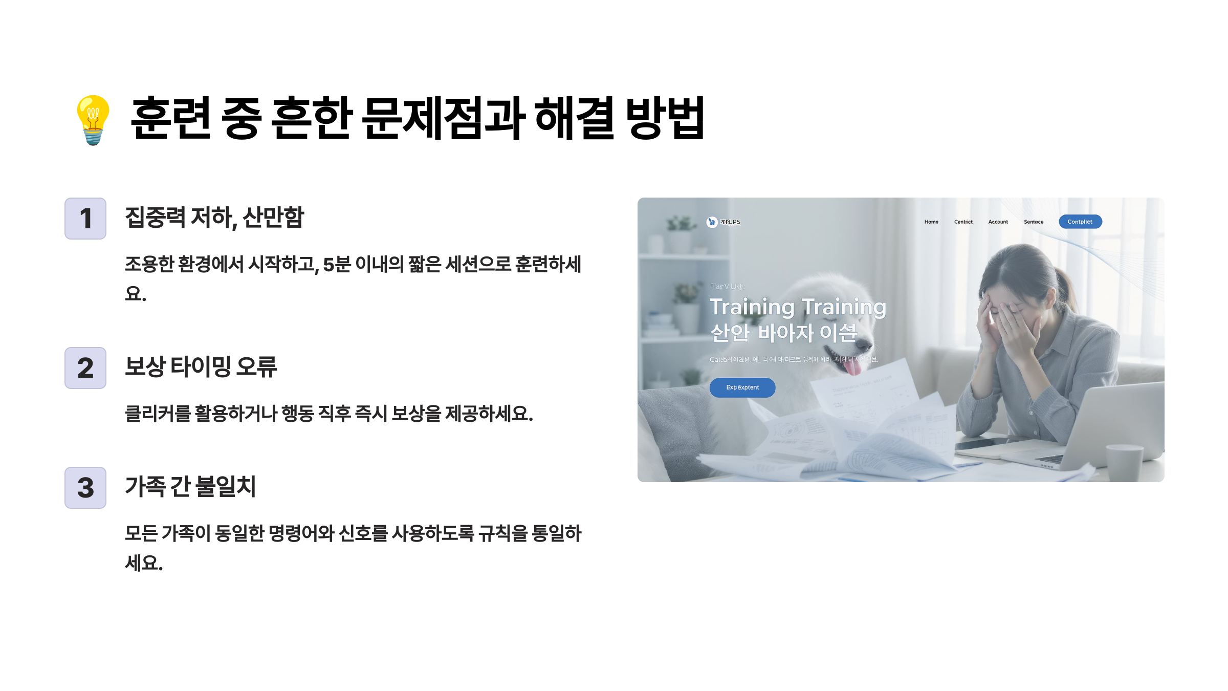 환경 설정도 훈련 성공의 중요한 요소예요. 처음에는 조용하고 방해 요소가 없는 곳에서 시작하세요. 집중력이 높아지면 점차 TV 소리, 다른 가족 구성원의 움직임 등 약간의 방해 요소를 추가해요. 최종적으로는 공원이나 카페 같은 실제 환경에서도 명령을 수행할 수 있도록 단계적으로 난이도를 높여가세요.