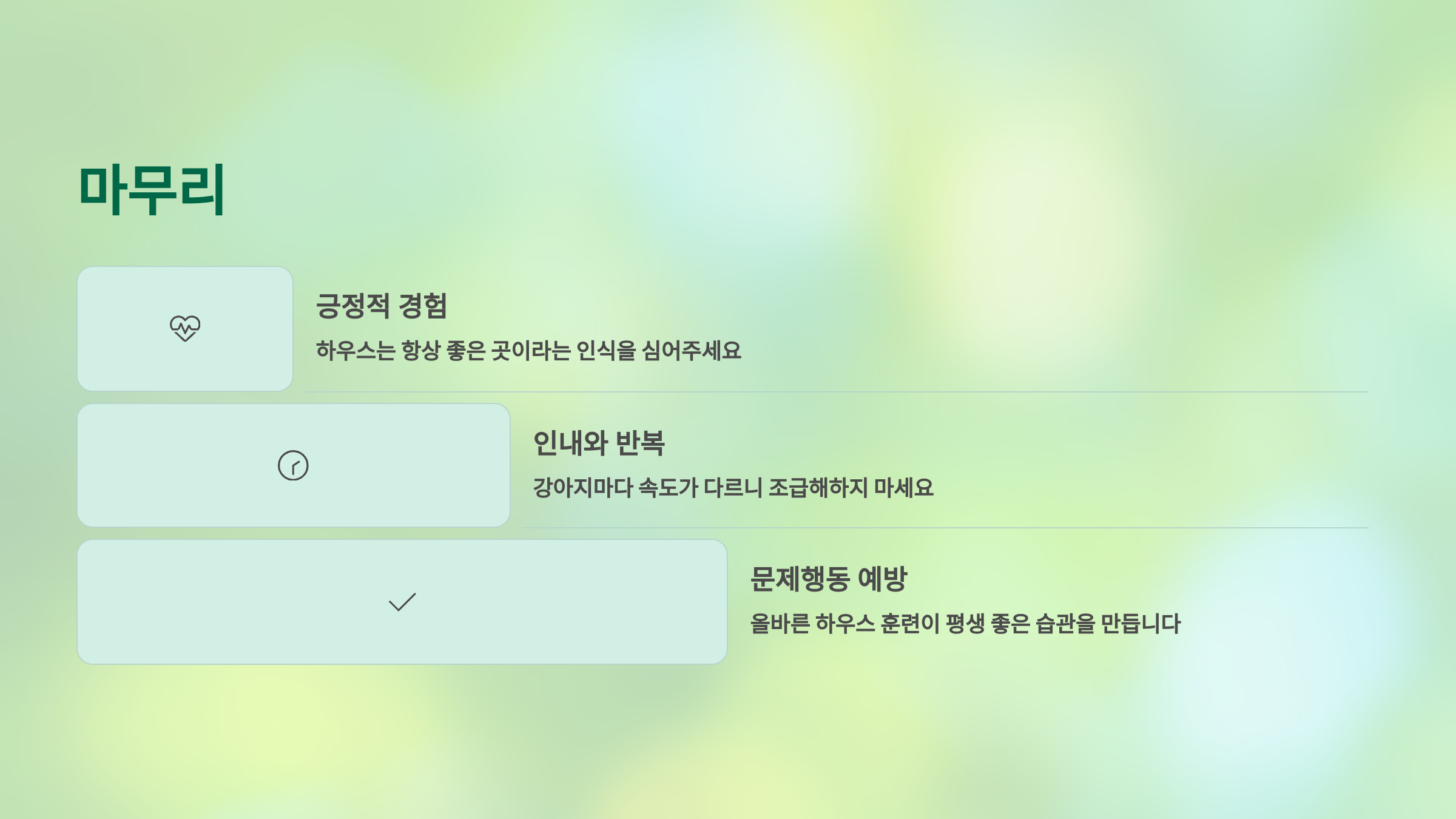 | 하우스 거부 | 부정적 경험 | 친숙화 재시작 | 처벌 도구 사용 금지 |