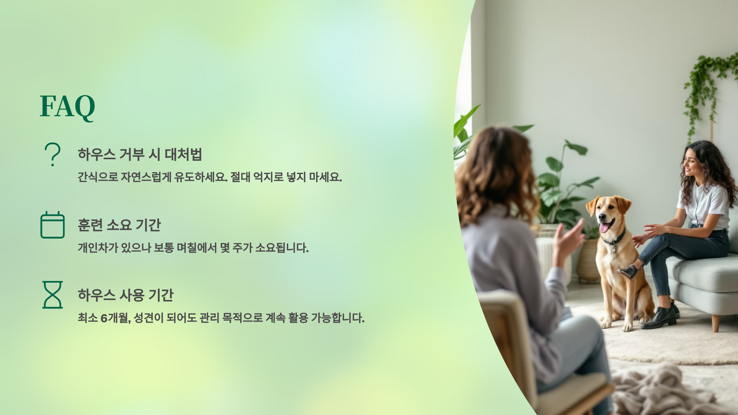 이 단계에서 주의해야 할 점은 강아지가 하우스에서 나오려고 할 때의 반응이에요. 만약 강아지가 나오려고 할 때 주인이 달려가서 문을 열어주거나 관심을 보이면, 강아지는 나오려고 하면 주인이 온다는 것을 학습하게 돼요. 대신 강아지가 조용히 있을 때 관심을 주고 칭찬해야 해요. 또한 이 시기에는 하우스에서 배변하는 사고가 발생할 수 있는데, 이때는 꾸짖지 말고 조용히 치운 후 하우스를 깨끗하게 청소해주세요. 강아지가 배변을 참을 수 있는 시간을 고려해서 훈련 시간을 조절하는 것도 중요해요.