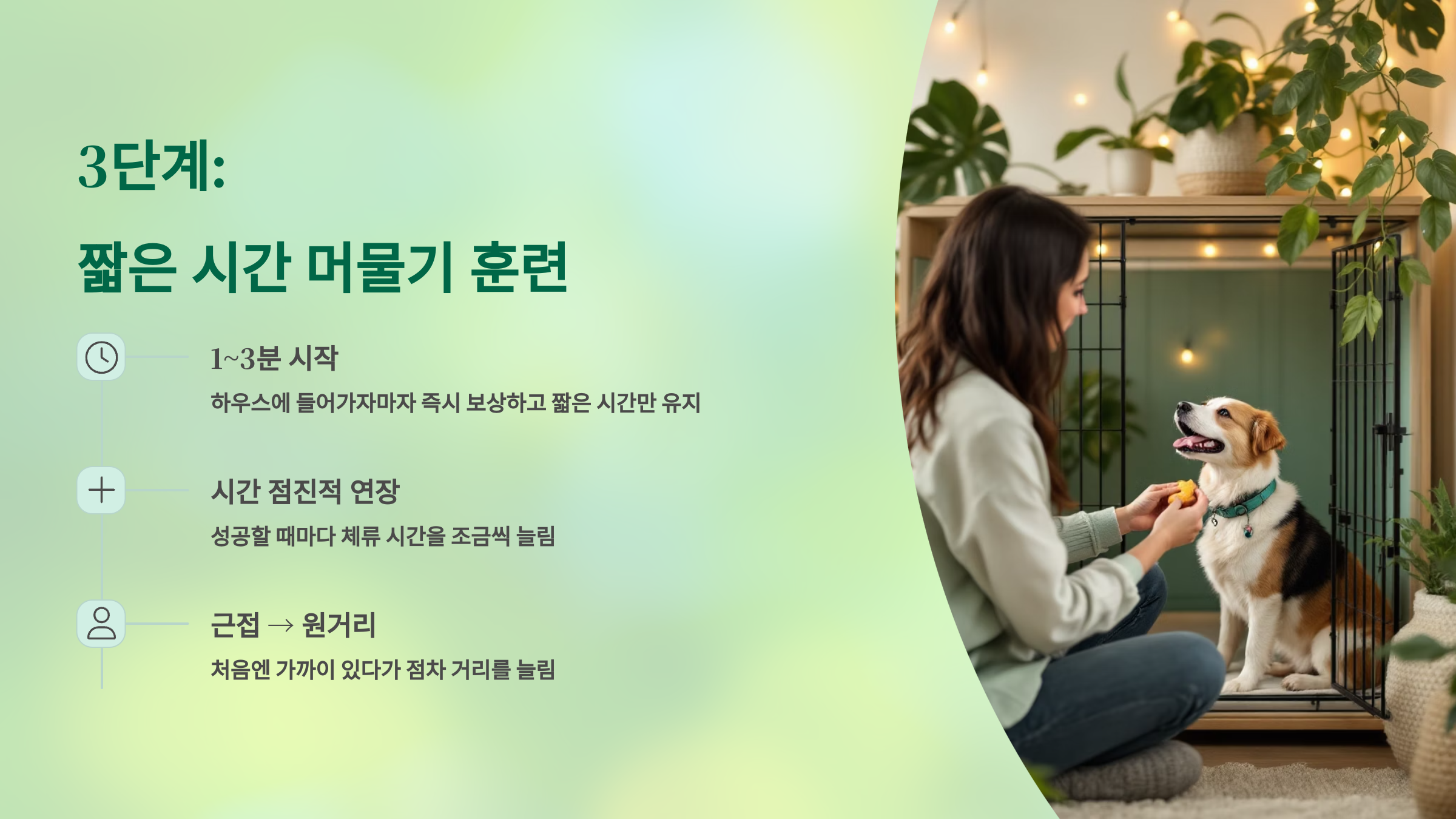 짧은 시간부터 점차 늘려가는 것이 핵심이에요. 강아지가 스트레스받지 않는 선에서 천천히 진행하면 성공할 수 있어요! ⏰