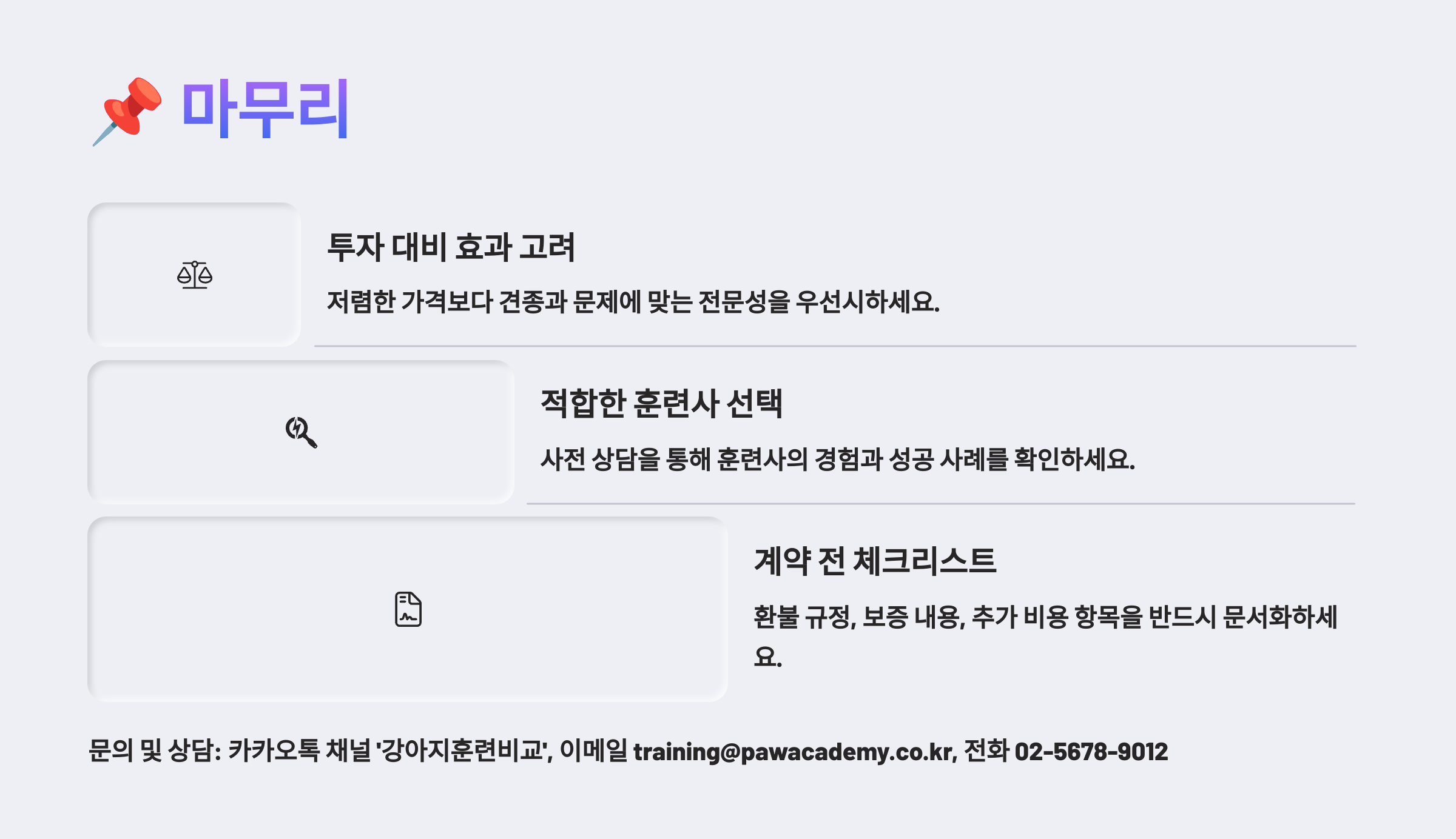 훈련소는 후기와 실 사례를 꼭 비교해보는 게 중요해요. 가격만 보면 놓칠 수 있는 부분이 많거든요. 효과 중심으로 접근해야 '잘 고른 훈련소'가 된답니다! 🐕✨