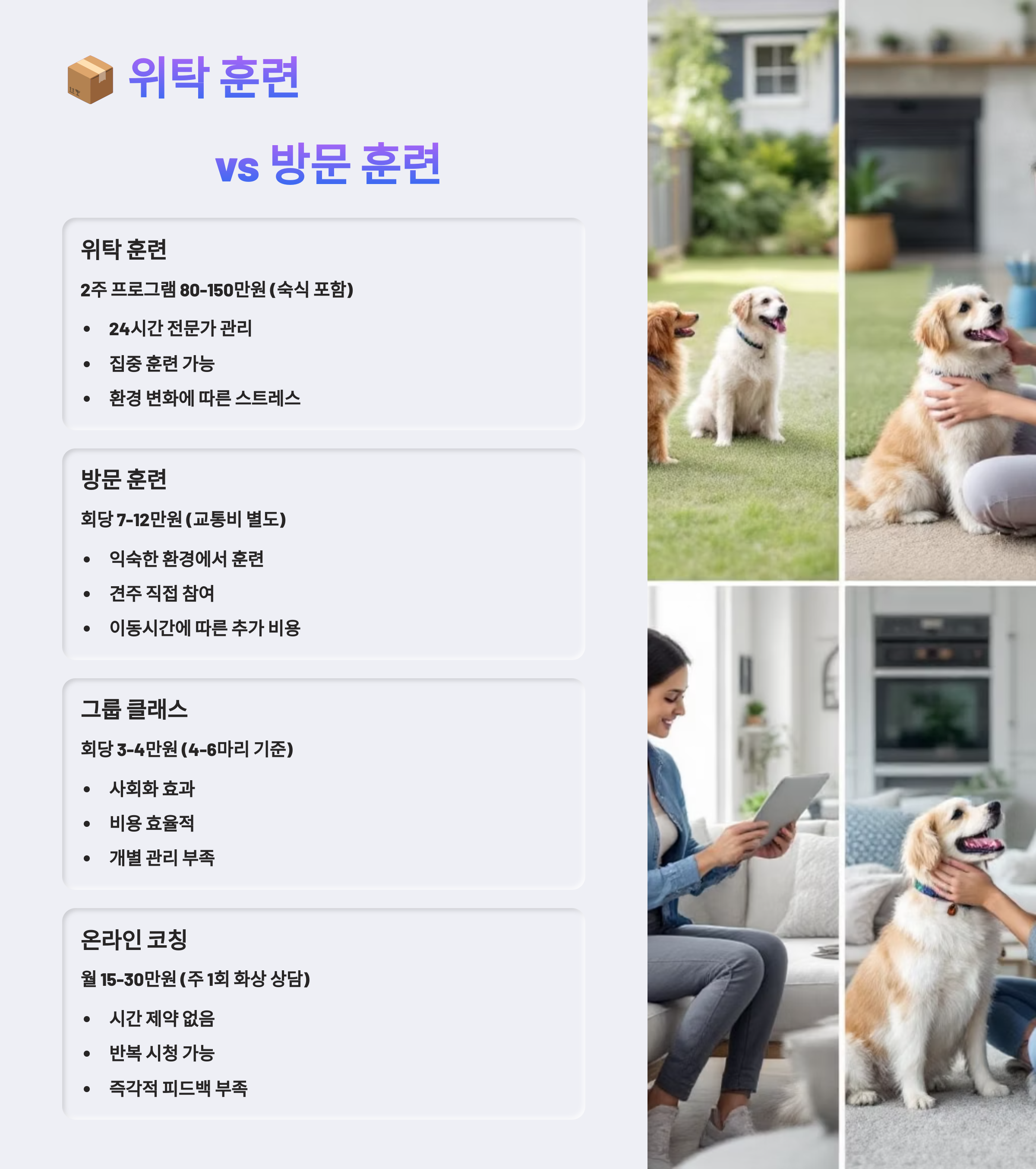 훈련방식에 따라도 가격은 달라져요. 대표적인 두 가지는 위탁 훈련과 방문 훈련이에요. 각 방식의 장단점과 평균 비용도 꼭 알고 선택해야 해요.