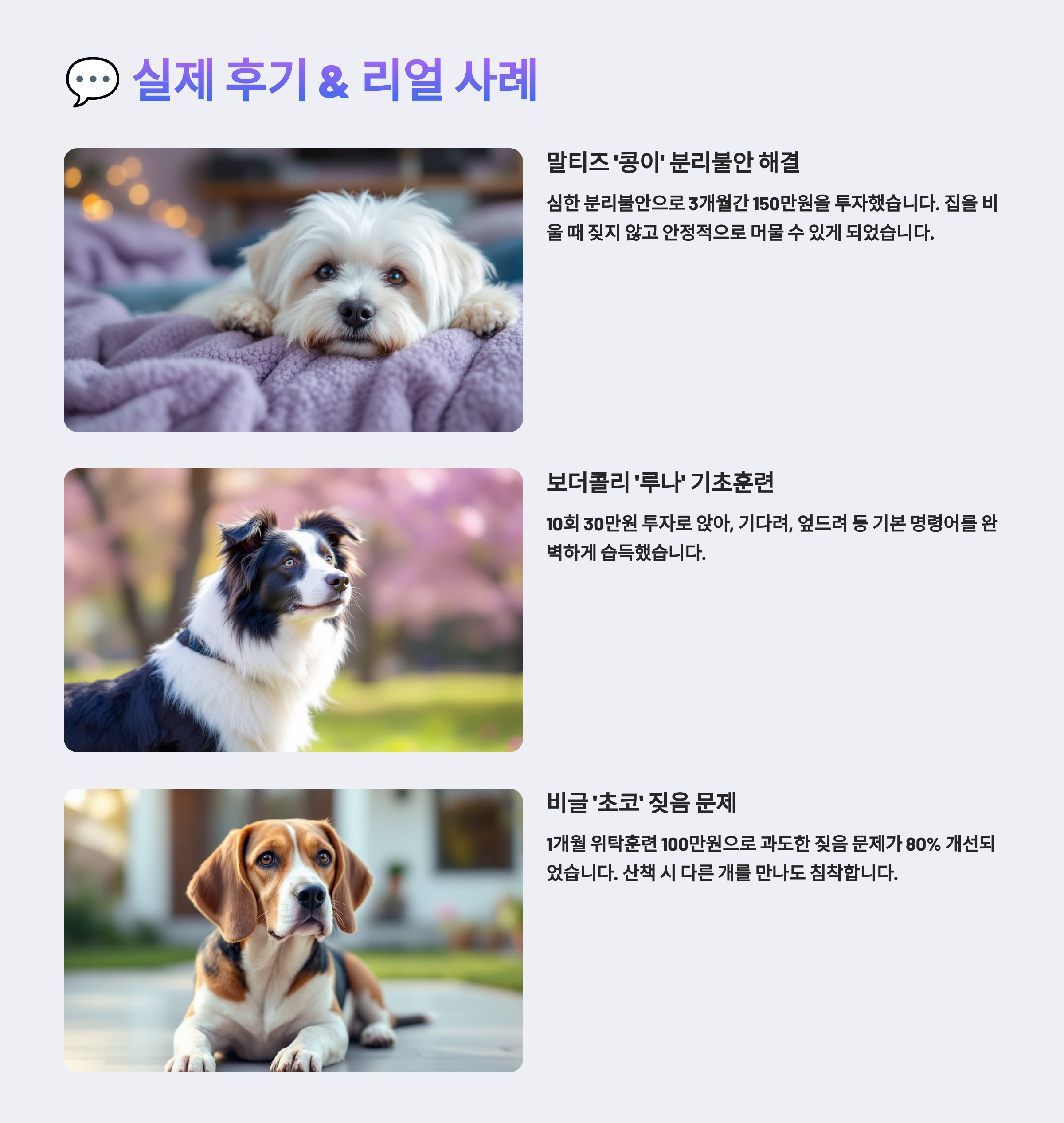 | 문제행동 교정 | 70만~150만 원 | 짖음, 공격성, 분리불안 |