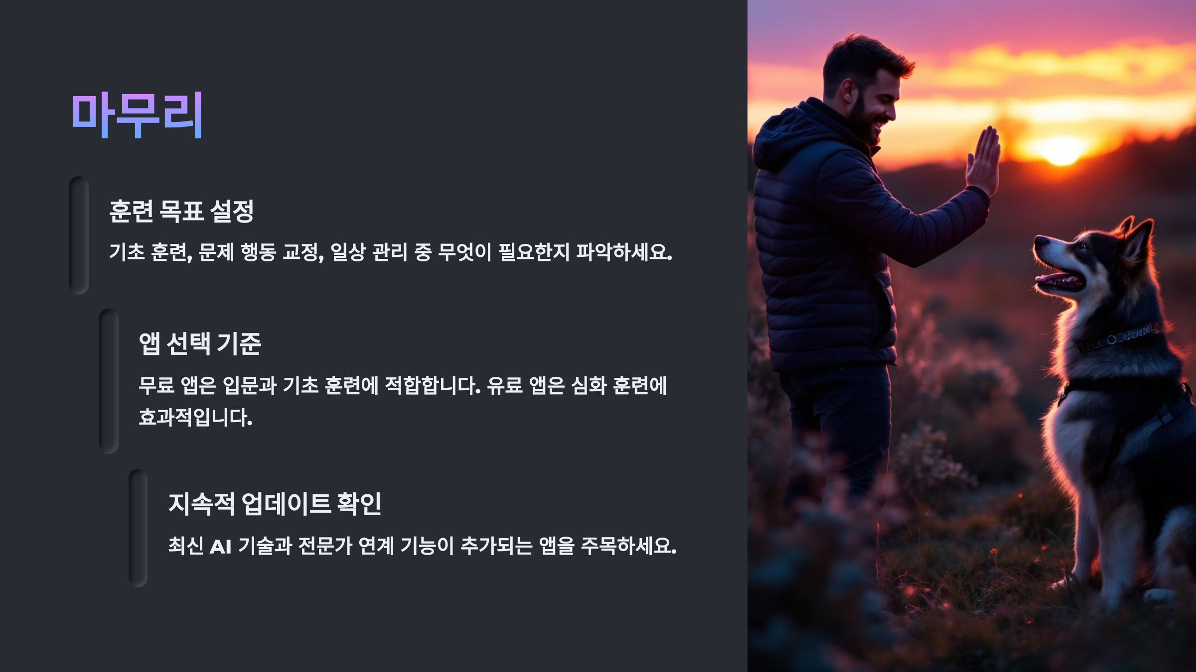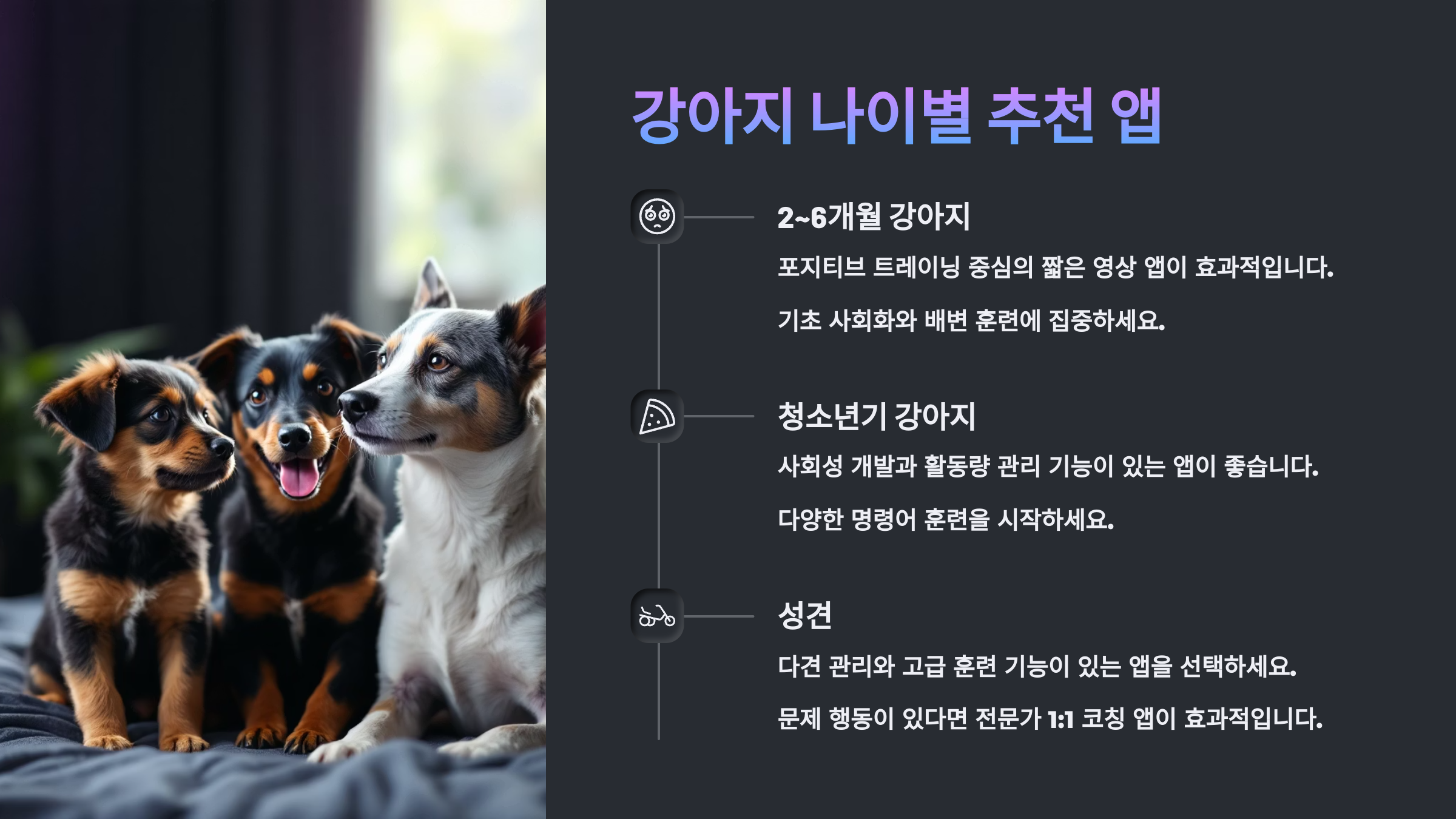 강아지의 상태와 훈련 목표에 따라 전문가 앱과 일반 앱을 적절히 선택하는 것이 좋아요 🎓