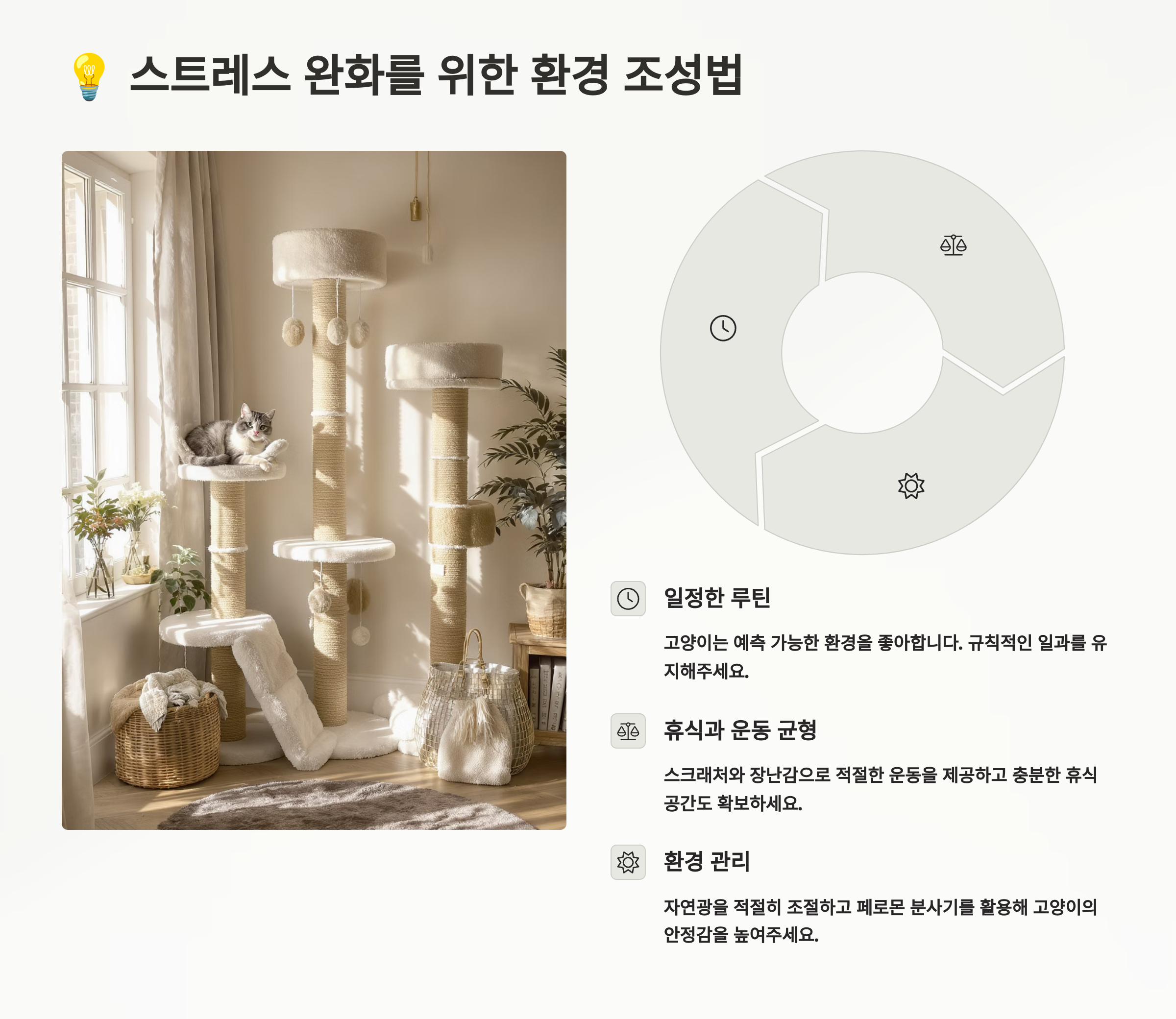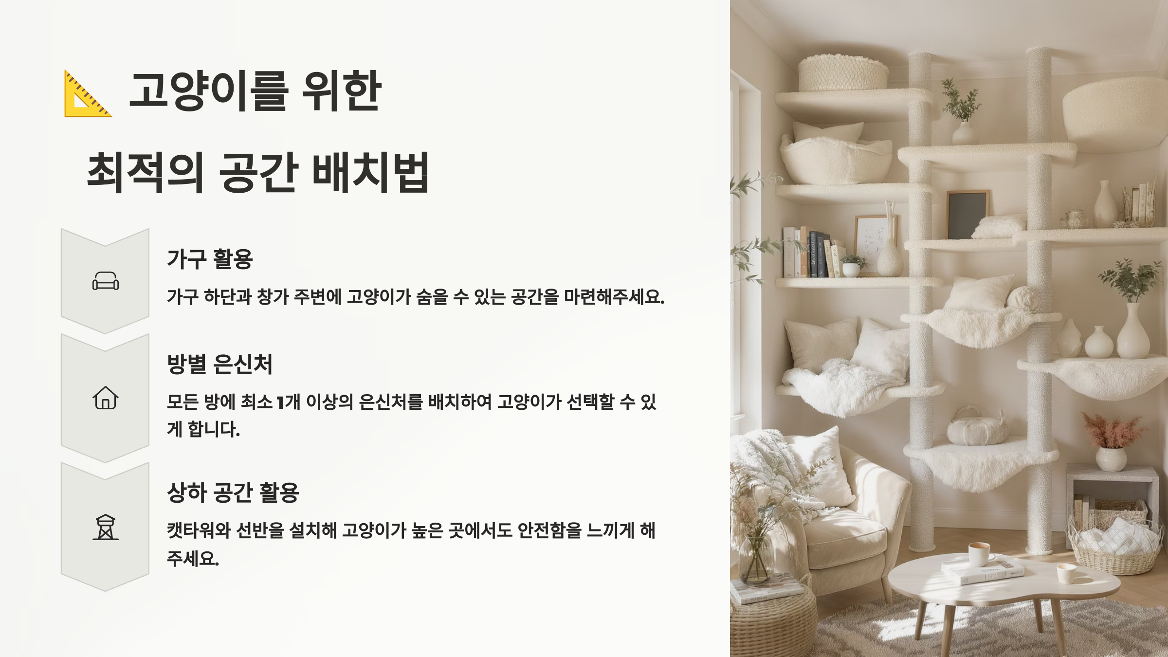 | 거실 | 캣타워, 스크래처 | 창가 근처, TV 시야 확보 |