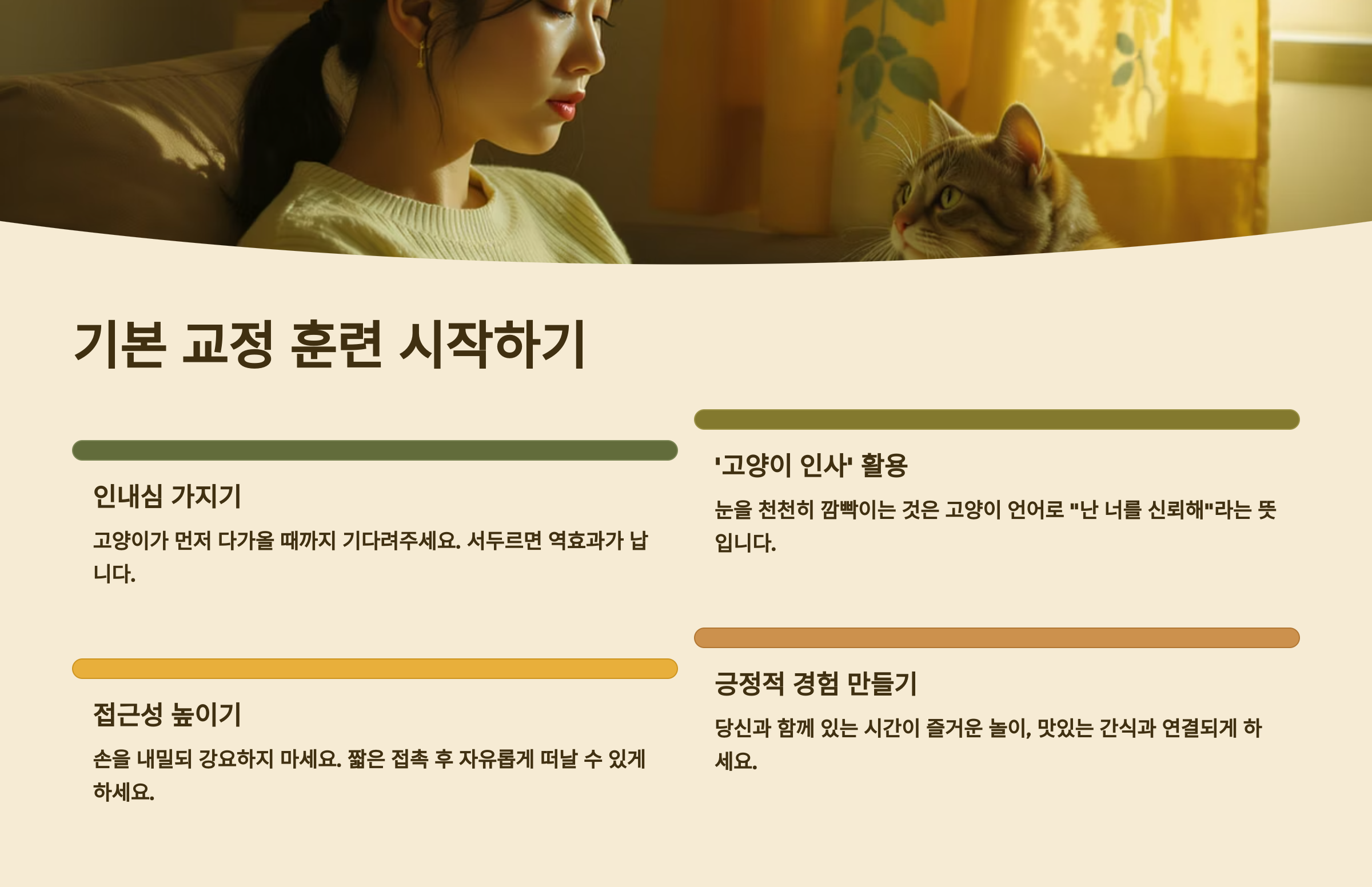 | 칭찬과 쓰다듬기 | 일상적인 강화 | 고양이 성향 고려 |