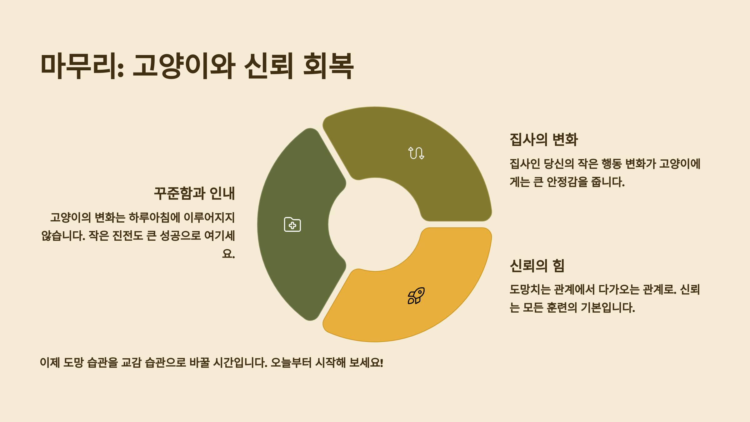 오늘 소개해드린 다양한 방법들을 모두 한 번에 시도하기보다는, 여러분의 고양이 성격과 상황에 맞는 것부터 하나씩 적용해보세요. 작은 성공이 쌓여서 큰 변화를 만들어낼 거예요. 그리고 기억하세요. 고양이도 여러분을 사랑하고 있고, 함께 있고 싶어한다는 것을요. 단지 때로는 호기심이나 본능이 그 마음을 앞서갈 뿐이에요.