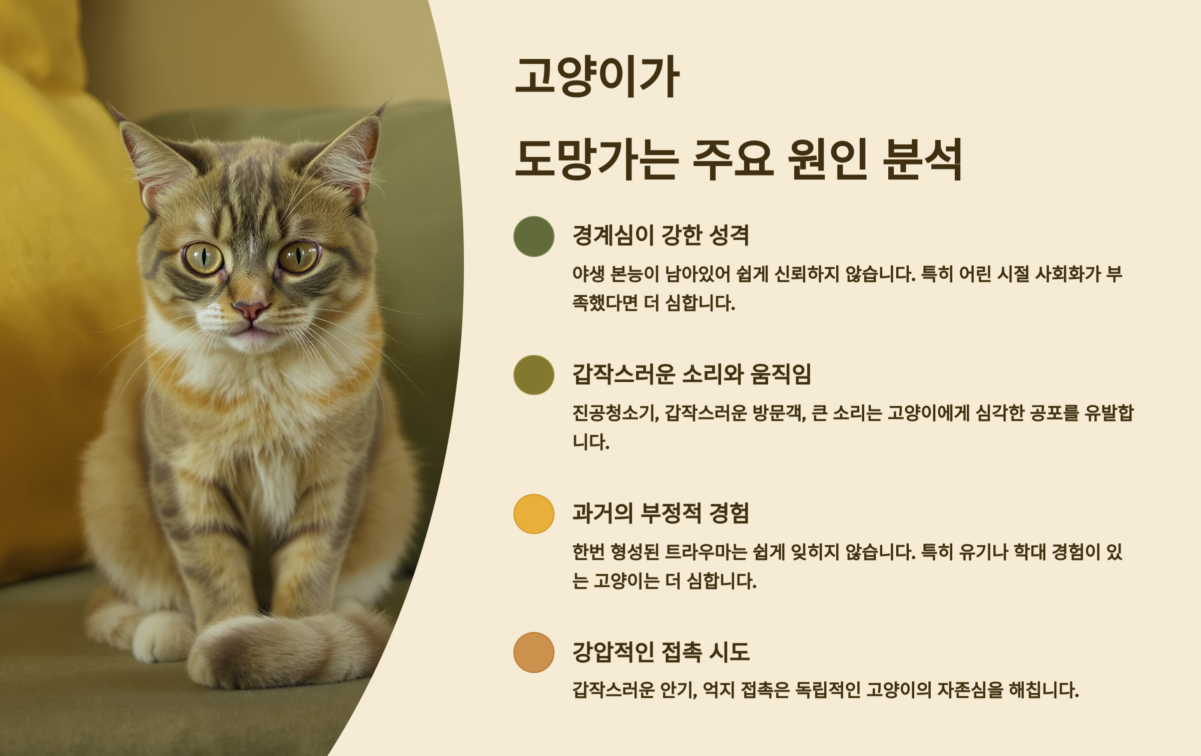 고양이의 도망 습관은 많은 집사들이 겪는 고민이에요. 사랑하는 반려묘가 문틈으로 빠져나가려 하거나 실제로 도망가는 경험은 정말 가슴 철렁한 일이죠. 하지만 적절한 훈련과 환경 개선을 통해 이런 행동을 충분히 교정할 수 있답니다. 오늘은 고양이가 도망가는 원인부터 단계별 훈련법까지 자세히 알아볼게요.