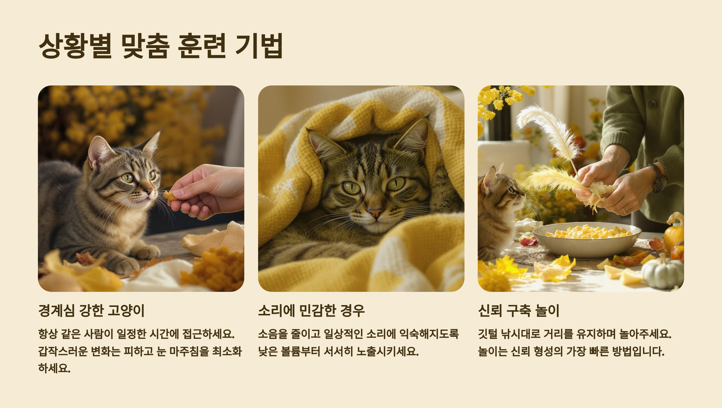 훈련 중에는 절대 처벌하거나 큰 소리를 내면 안 돼요. 고양이는 부정적인 경험을 오래 기억하기 때문에 훈련 자체를 거부하게 될 수 있어요. 실수를 했을 때는 무시하고, 잘했을 때만 보상하는 긍정적 강화 방식을 사용하세요. 인내심을 가지고 꾸준히 하면 반드시 좋은 결과를 볼 수 있답니다! 💪