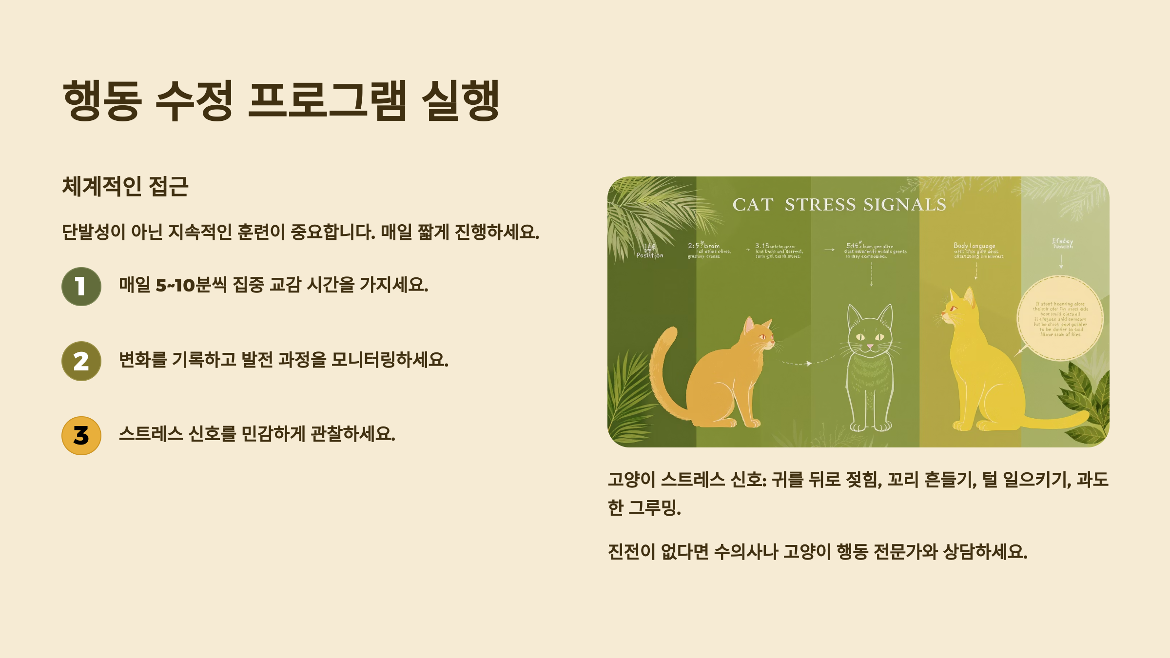 마지막으로 전문가의 도움을 받는 것도 고려해보세요. 행동 수정이 잘 안 되거나 고양이의 스트레스가 심해 보인다면 동물행동 전문가나 수의사와 상담하는 것이 좋아요. 때로는 약물 치료가 필요한 경우도 있고, 전문적인 행동 치료 프로그램이 도움이 될 수 있어요. 혼자 해결하려고 하지 말고 필요할 때는 도움을 요청하는 것이 현명한 선택이랍니다! 💪