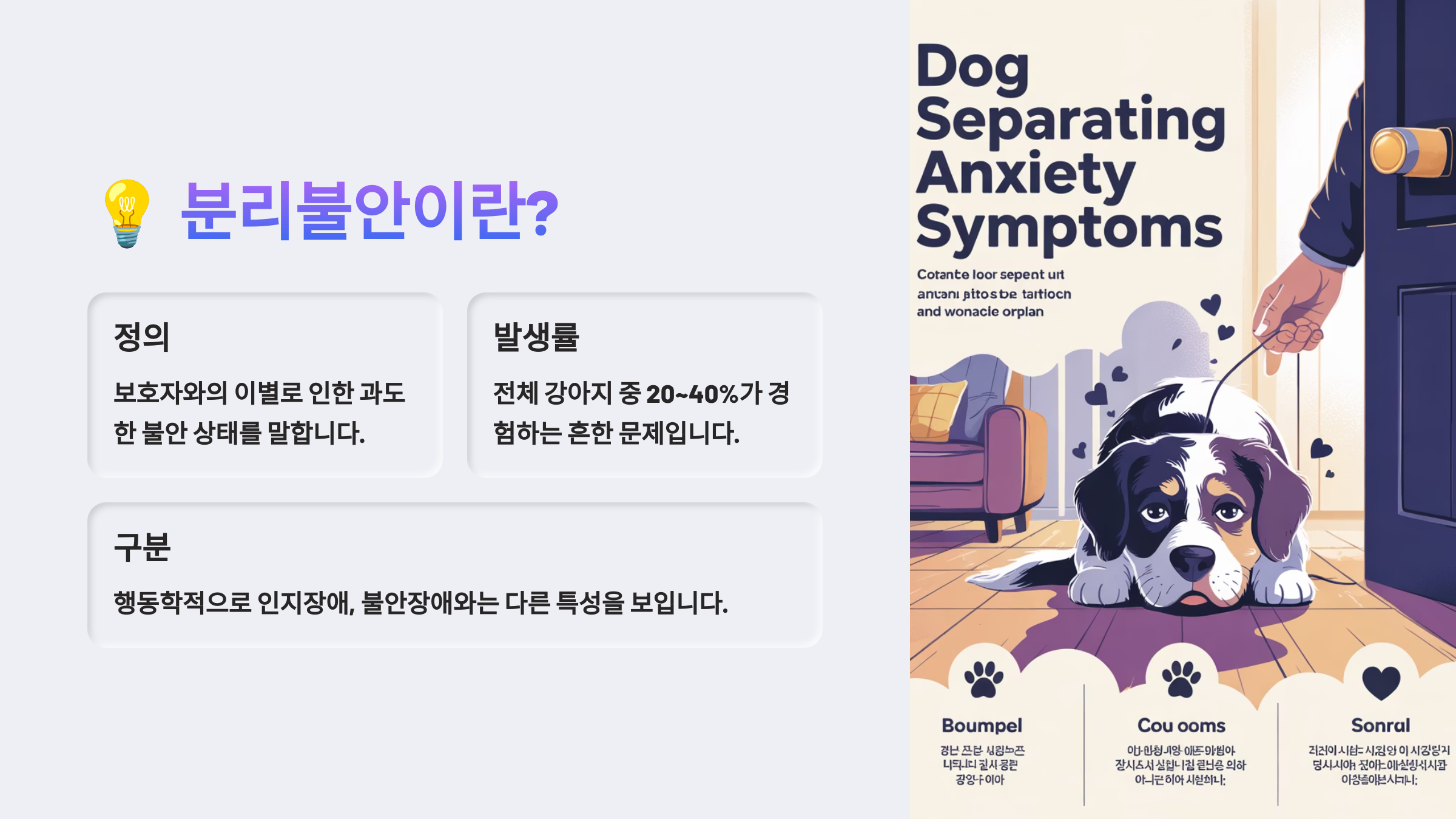 분리불안은 강아지가 보호자와 떨어져 있을 때 느끼는 과도한 불안감을 말해요. 단순히 '혼자 있는 걸 싫어한다'는 차원을 넘어서, 심리적 고통이나 공포 반응을 겪는 상태예요. 특히 사람과의 유대감이 강한 반려견일수록 분리불안이 심하게 나타나는 경향이 있어요.