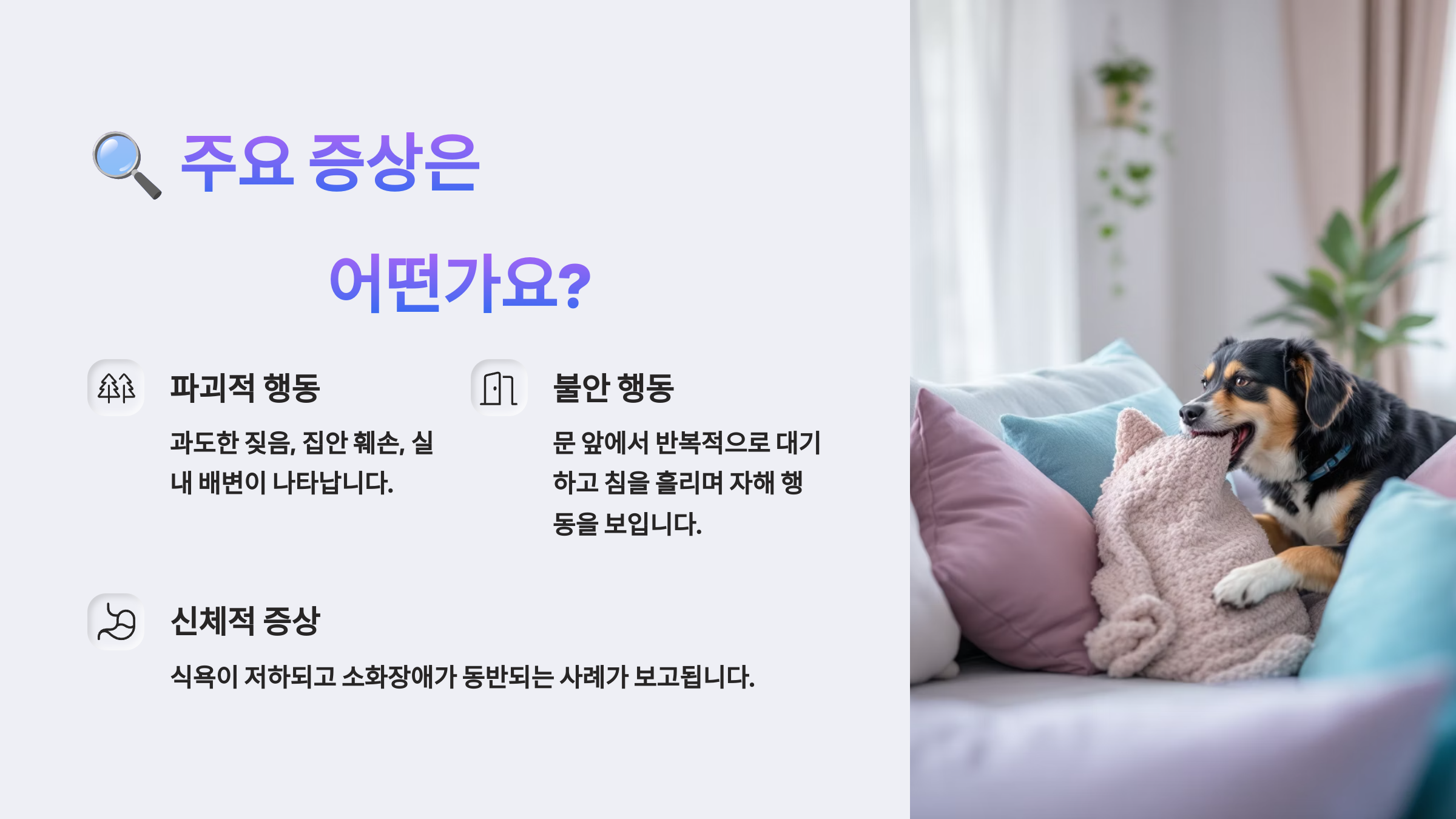 이 증상은 강아지에게도 고통스럽고, 보호자에게도 생활의 불편함과 정서적 부담을 줘요. 혼자 있는 동안 지속적으로 짖거나, 물건을 망가뜨리거나, 배변 실수를 하는 경우도 흔하고요. 훈련 없이 방치하면 습관화되거나 악화될 수 있어요.