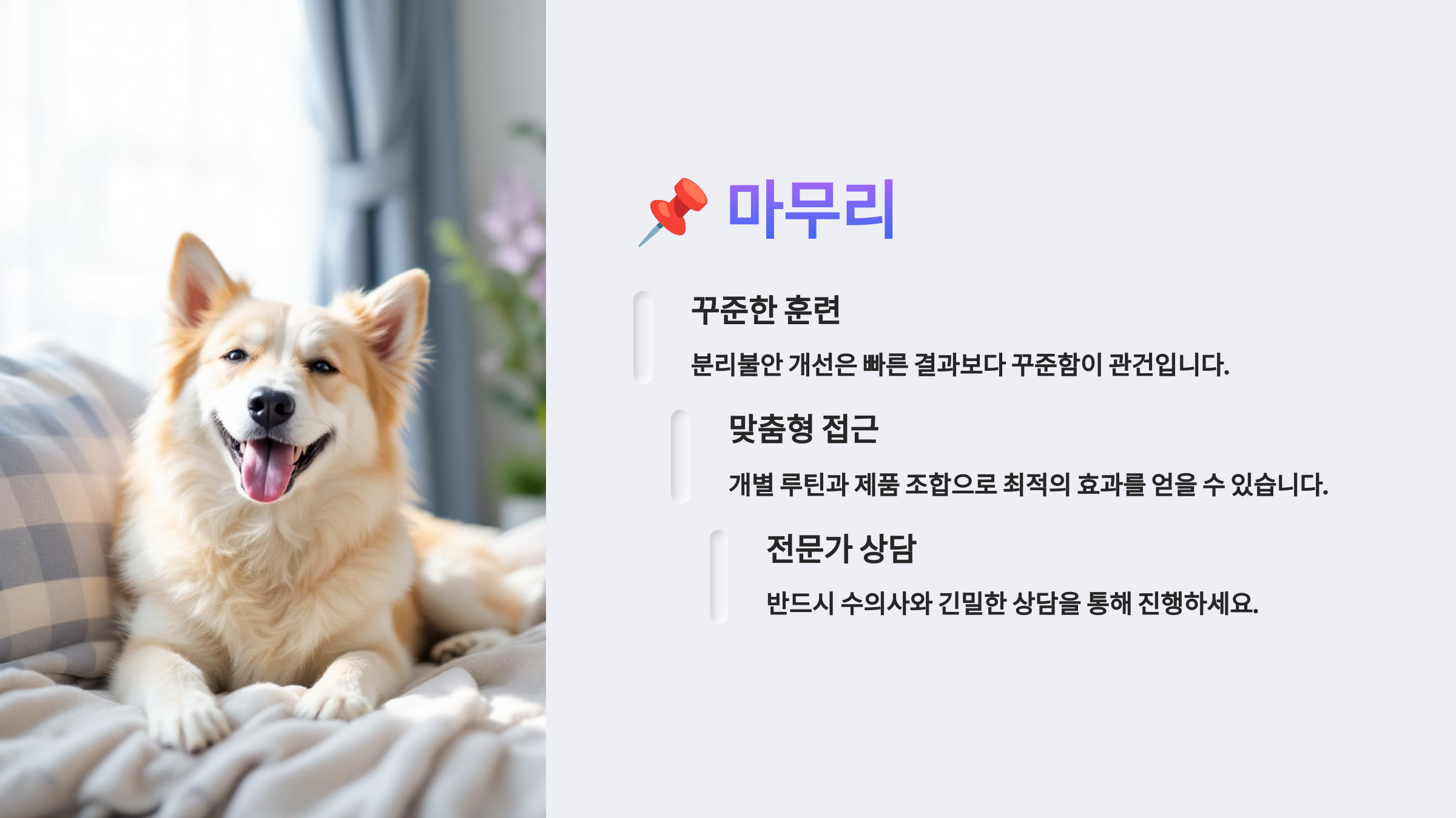 분리불안은 단순히 혼자 있는 걸 싫어하는 문제가 아니에요. 강아지의 정신 건강과 보호자의 일상까지 영향을 미치는 중요한 이슈예요. 하지만 다행히도 오늘 살펴본 것처럼, 훈련과 제품의 조합으로 충분히 개선이 가능하답니다.