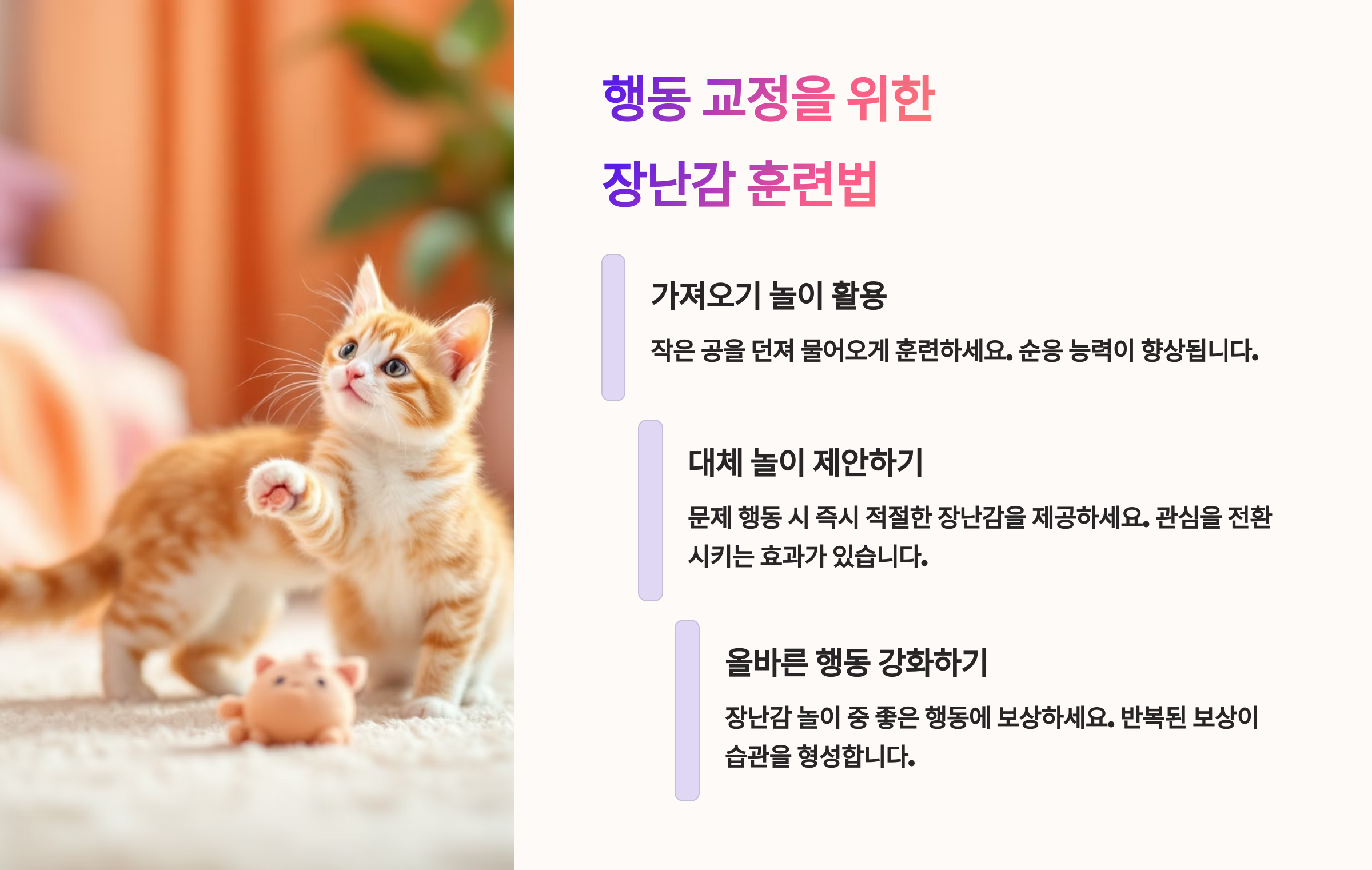 고양이의 문제 행동 중 가장 흔한 것이 가구 긁기예요. 이런 행동을 교정할 때 장난감을 활용하면 효과적이에요. 스크래치 포스트에 깃털 장난감을 매달아서 고양이의 관심을 유도하고, 올바른 곳에서 발톱을 갈도록 훈련할 수 있어요. 고양이가 가구를 긁으려고 할 때 장난감으로 주의를 돌린 다음, 스크래치 포스트로 유도하는 방법이 효과적이랍니다.