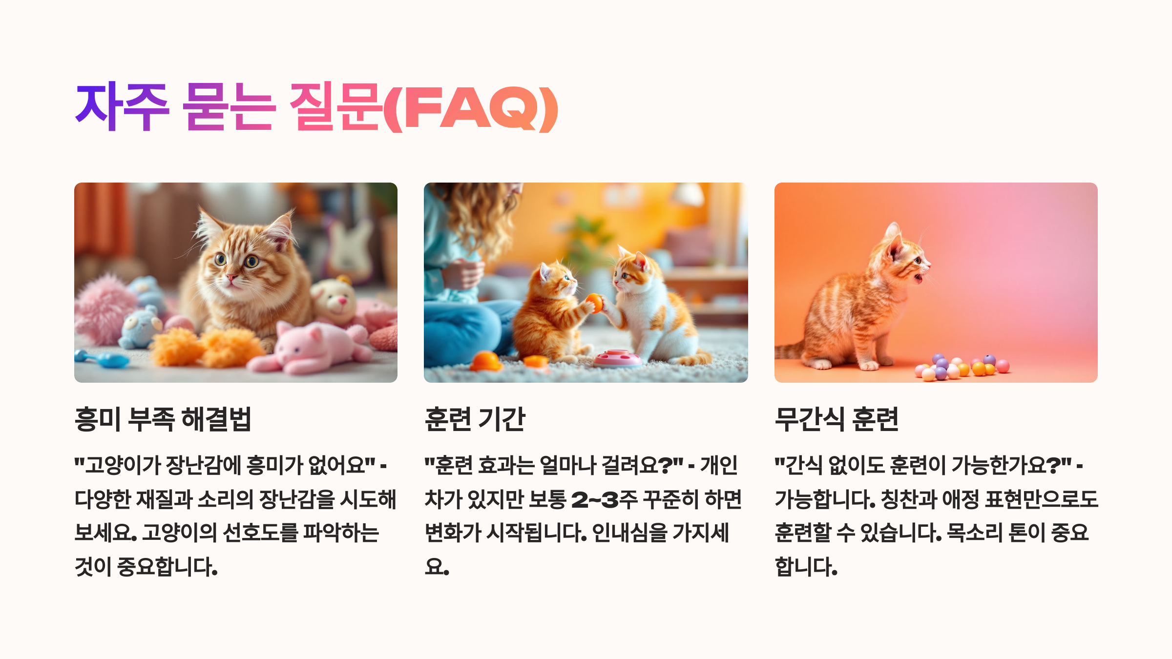 무엇보다 인내심을 가지고 꾸준히 해주세요. 고양이는 개와 달리 독립적인 성격이 강해서 훈련 효과가 나타나는 데 시간이 걸릴 수 있어요. 하지만 한 번 익숙해지면 장난감 훈련을 통해 더욱 건강하고 행복한 생활을 할 수 있을 거예요. 우리 고양이와 함께 즐거운 훈련 시간 보내시길 바라요. ✨