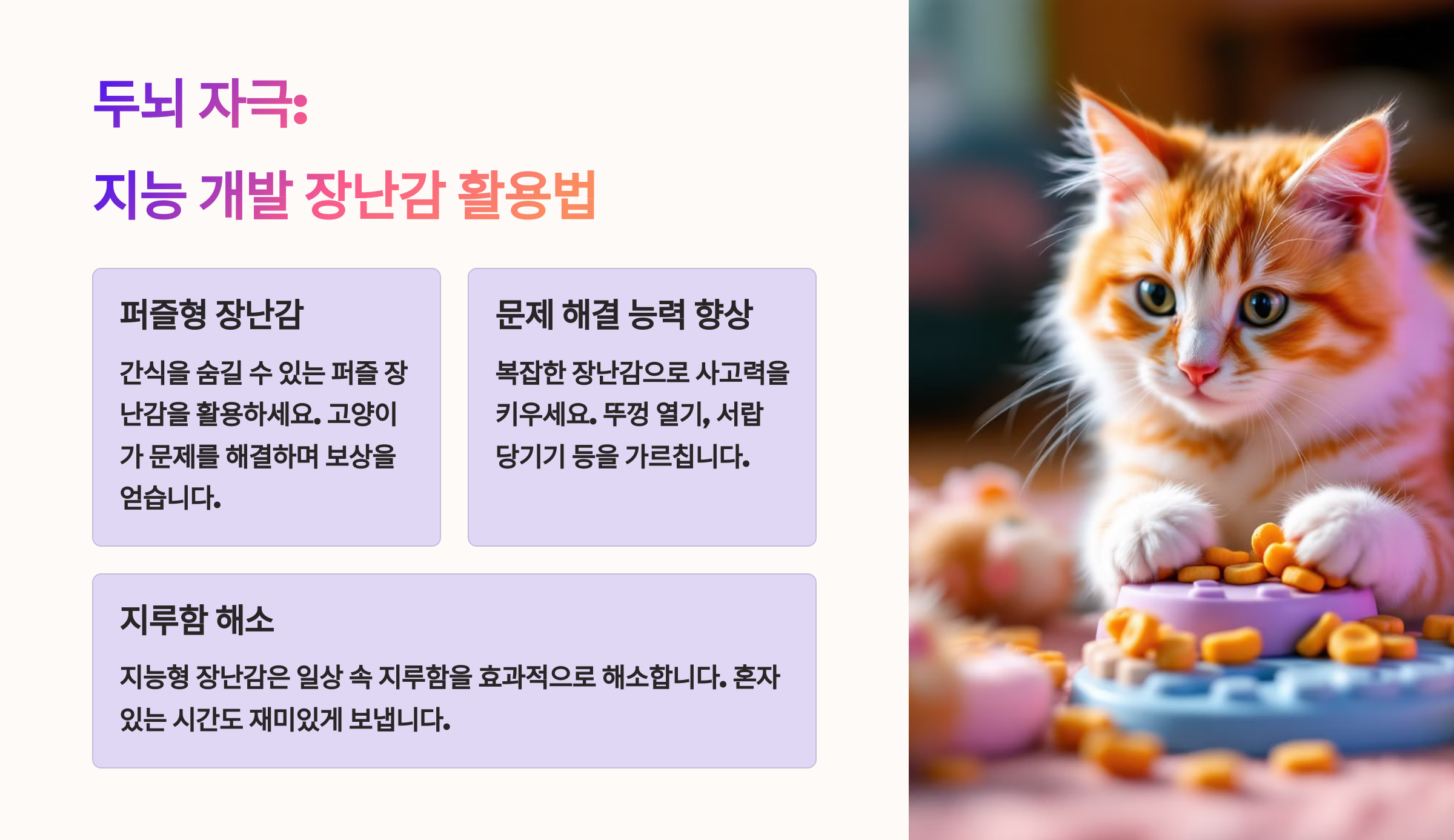 지능 개발 장난감은 고양이의 정신적 건강에도 도움이 돼요. 충분한 정신적 자극을 받은 고양이는 스트레스가 적고 문제 행동도 줄어들어요. 매일 조금씩이라도 두뇌를 사용할 수 있는 놀이를 제공해주는 것이 중요해요. 🧠