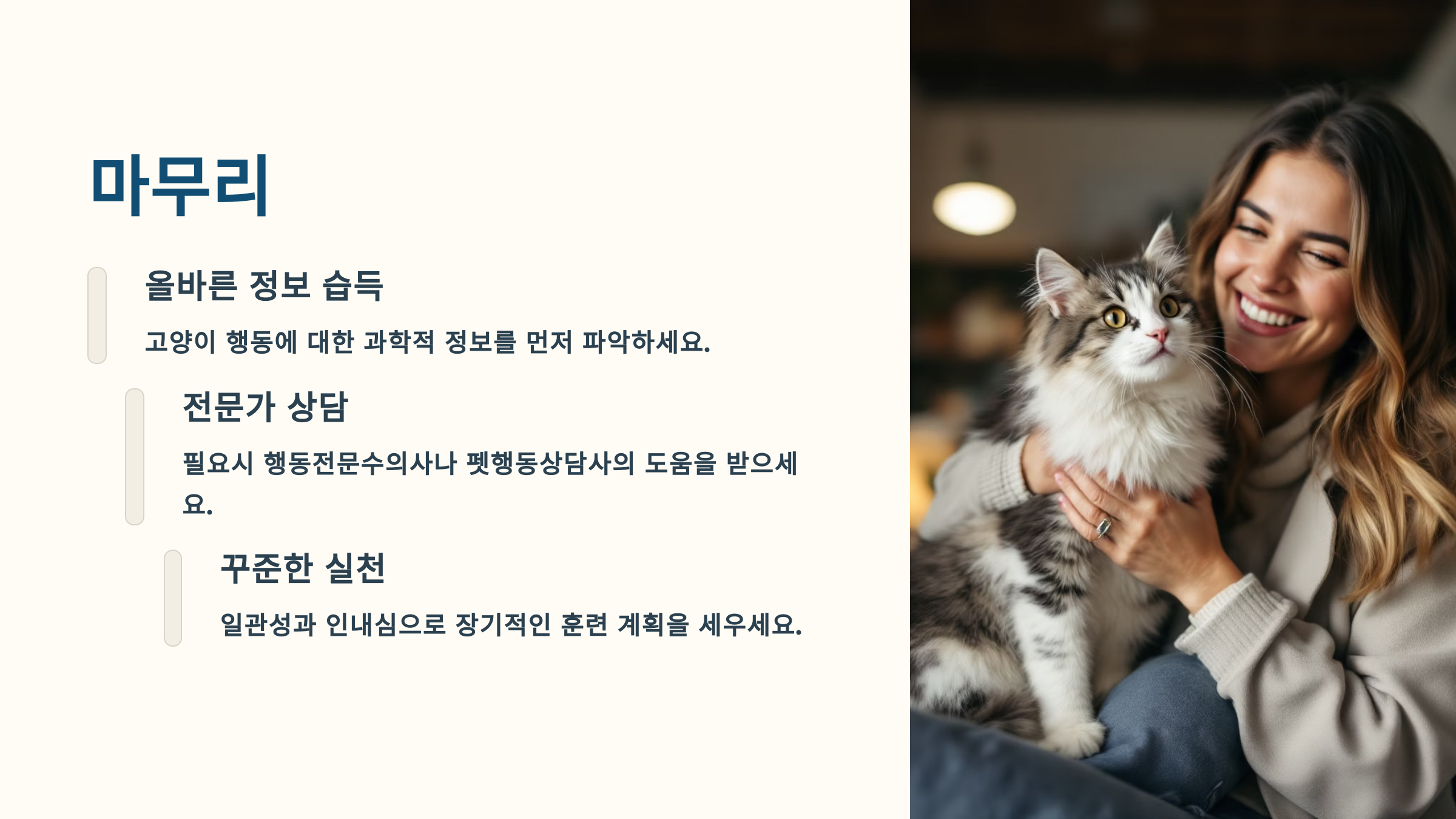 고양이의 문제행동이 지속적이거나 생활에 큰 지장을 준다면, 혼자 해결하기보다는 전문가의 상담과 행동치료를 받는 게 훨씬 좋아요. 이건 보호자와 반려묘 모두에게 스트레스를 줄이는 가장 현실적인 방법이기도 하죠. 💡😺
