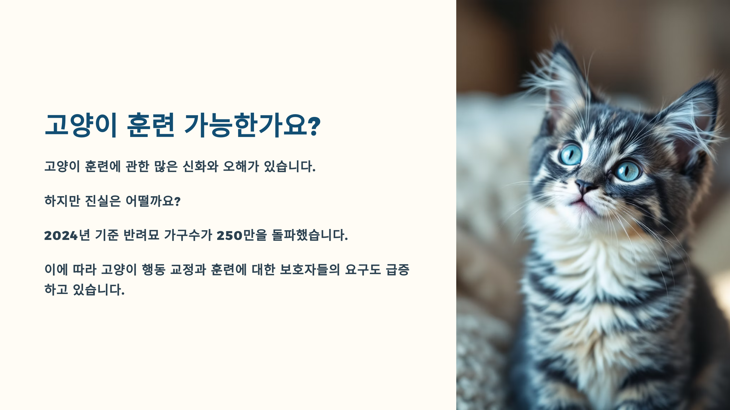 많은 사람들은 고양이를 독립적이고 고집 센 동물로 생각해요. 그래서 “훈련이 안 된다”는 이미지가 강하죠. 하지만 사실은 고양이도 훈련이 충분히 가능해요. 다만 훈련의 방식과 접근법이 강아지와는 완전히 다르다는 것만 이해하면 돼요. 😼