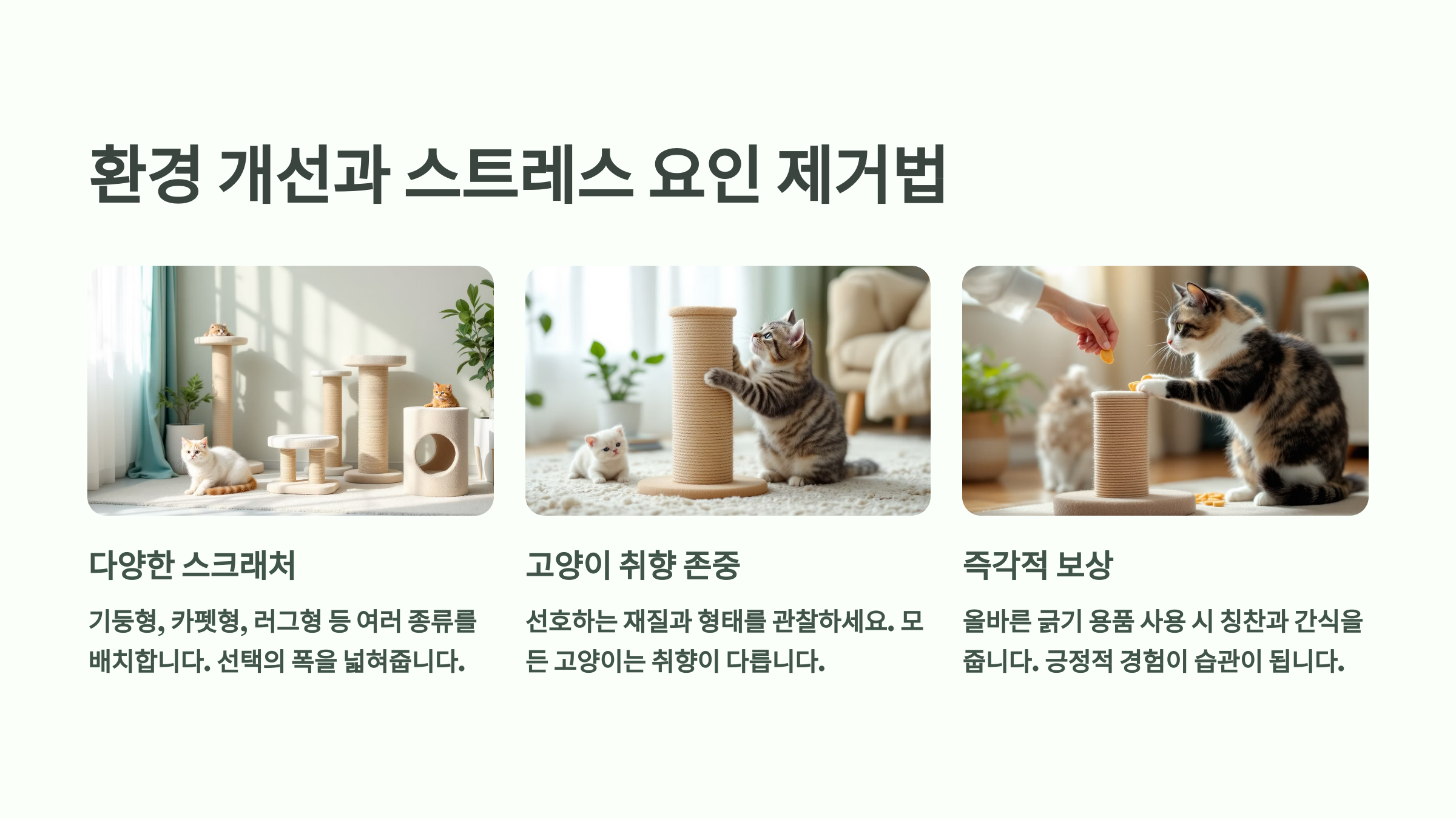 훈련 중에는 절대 처벌하지 마세요. 고양이가 문을 긁는다고 소리를 지르거나 물을 뿌리면, 집사에 대한 신뢰가 깨져서 오히려 더 숨어서 문제 행동을 할 수 있어요. 대신 조용히 방해하고 스크래칭 포스트로 유도한 다음, 올바른 행동을 하면 크게 칭찬해주는 방식으로 접근하세요.