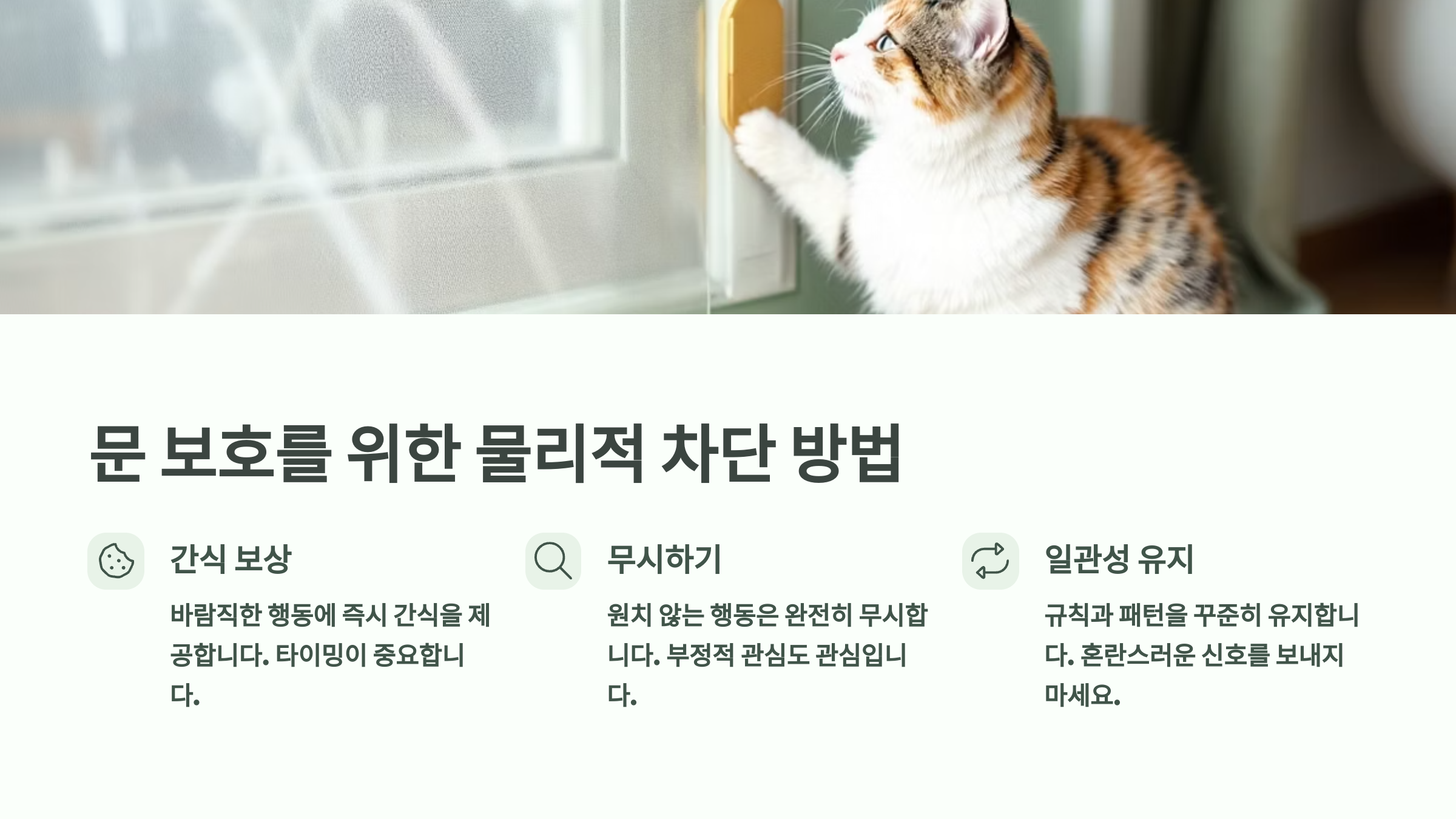 마지막으로 타이밍도 중요해요. 고양이가 문을 긁기 시작하는 바로 그 순간에 개입해야 하고, 이미 긁기를 마친 후에는 소용이 없어요. 따라서 고양이의 행동 패턴을 잘 관찰해서 언제 문을 긁는지 파악하는 게 선행되어야 한답니다. 🎯