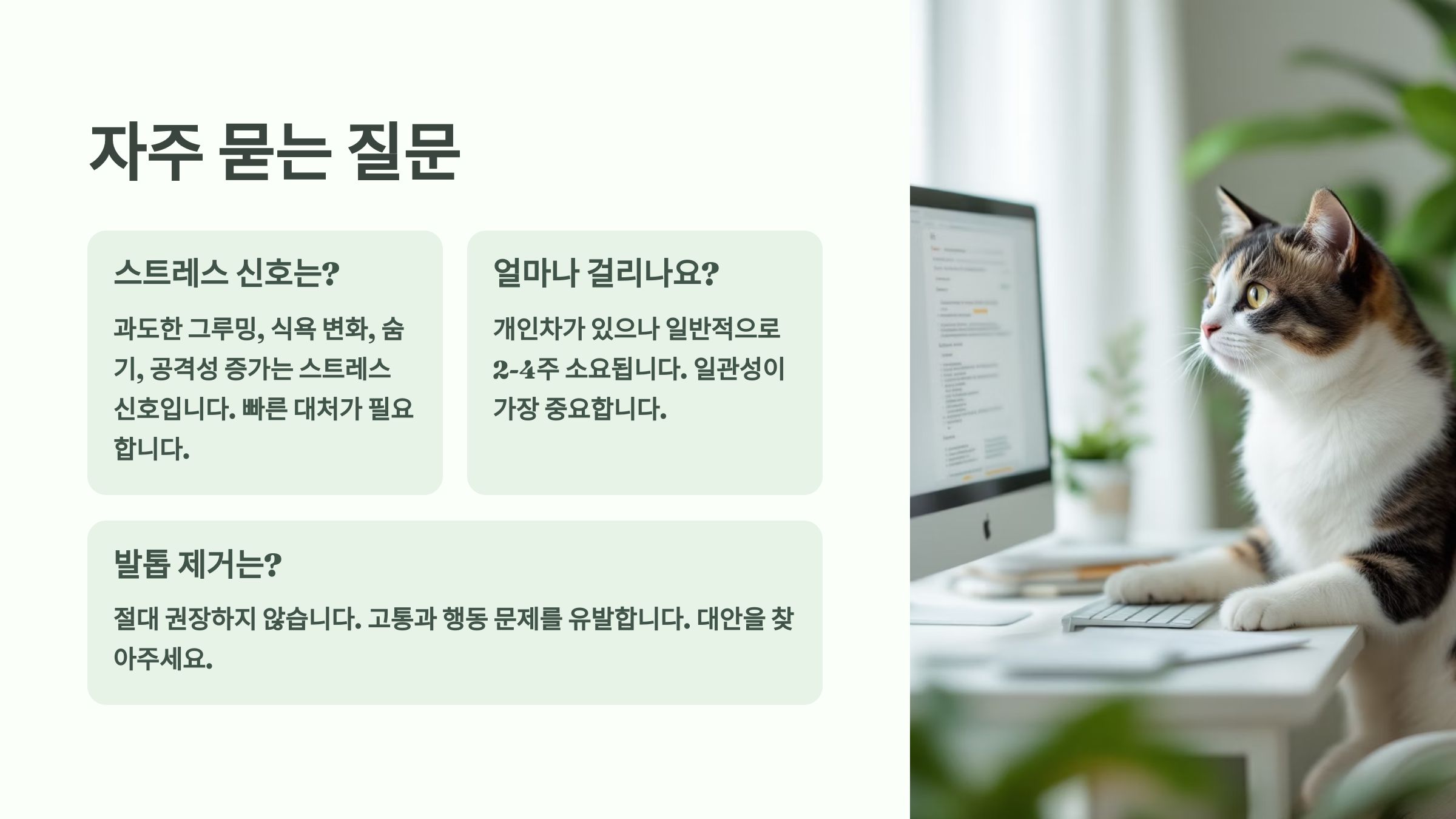 A6. 발톱 깎기는 손상을 줄이는 역할일 뿐, 긁는 행동 자체를 멈추게 하지는 못해요. 근본적인 해결을 위해서는 대안 제공, 환경 개선, 스트레스 관리 등 종합적인 접근이 필요해요.