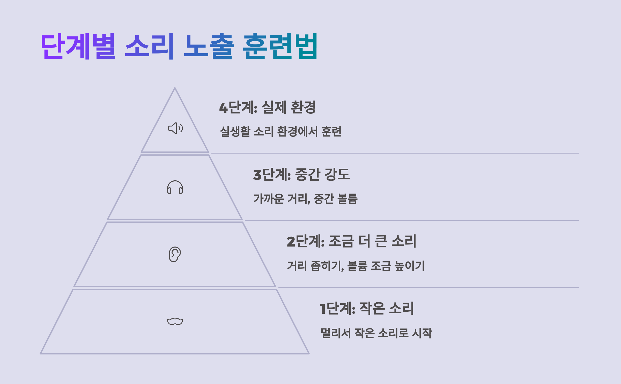 훈련은 3단계로 나눌 수 있어요. 1단계는 소리를 낮게 들려주는 '소리 익숙해지기', 2단계는 보상과 함께 들려주는 '긍정 연관 훈련', 3단계는 실제 상황에서의 '응용 실전 훈련'이에요. 각 단계마다 아이의 반응을 잘 체크해줘야 해요. 👀