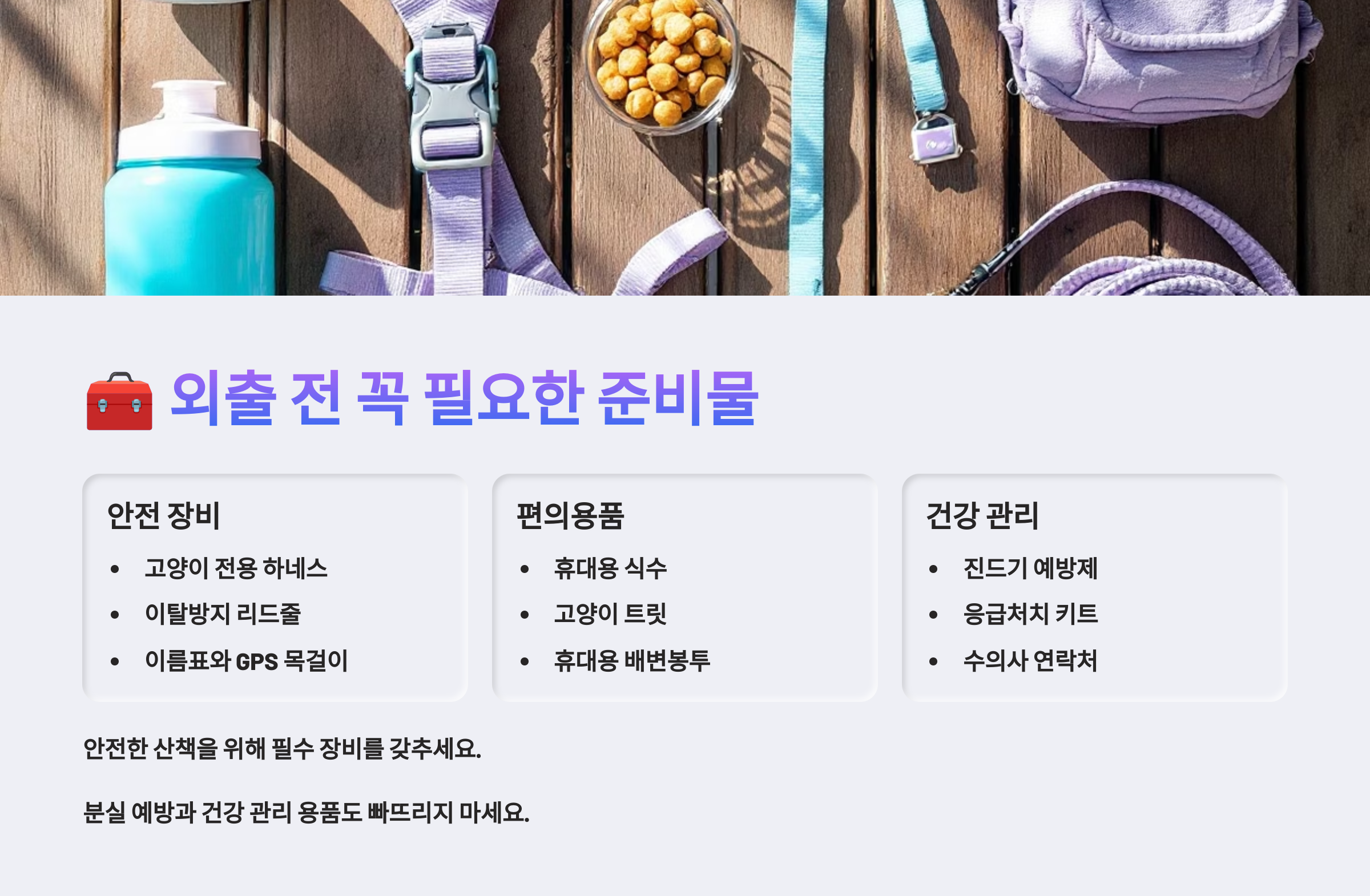 이제 고양이 산책이 왜 중요한지 이해하셨다면, 본격적으로 외출을 준비해야겠죠? 다음은 🧰 외출 전 꼭 필요한 준비물을 확인해볼게요!