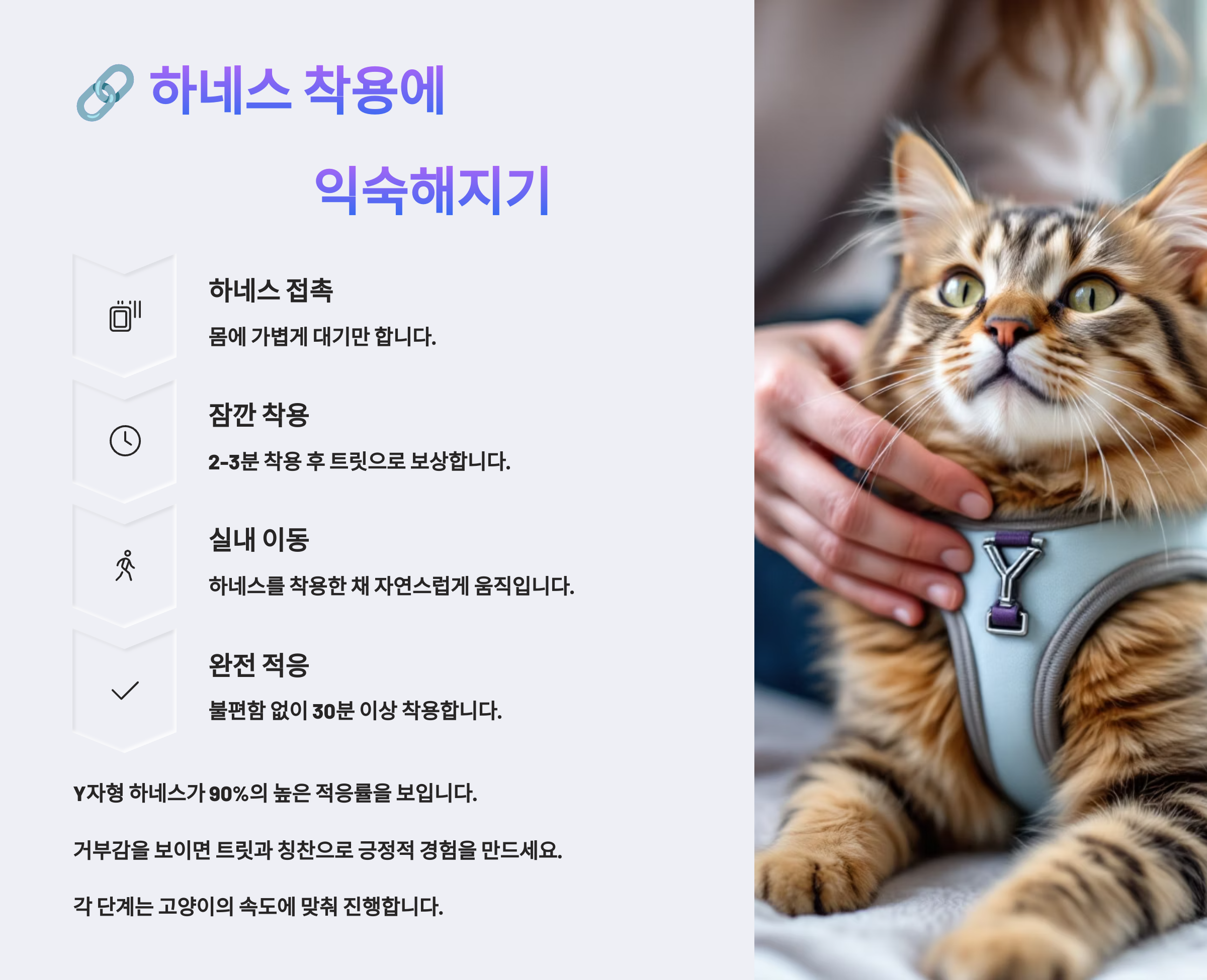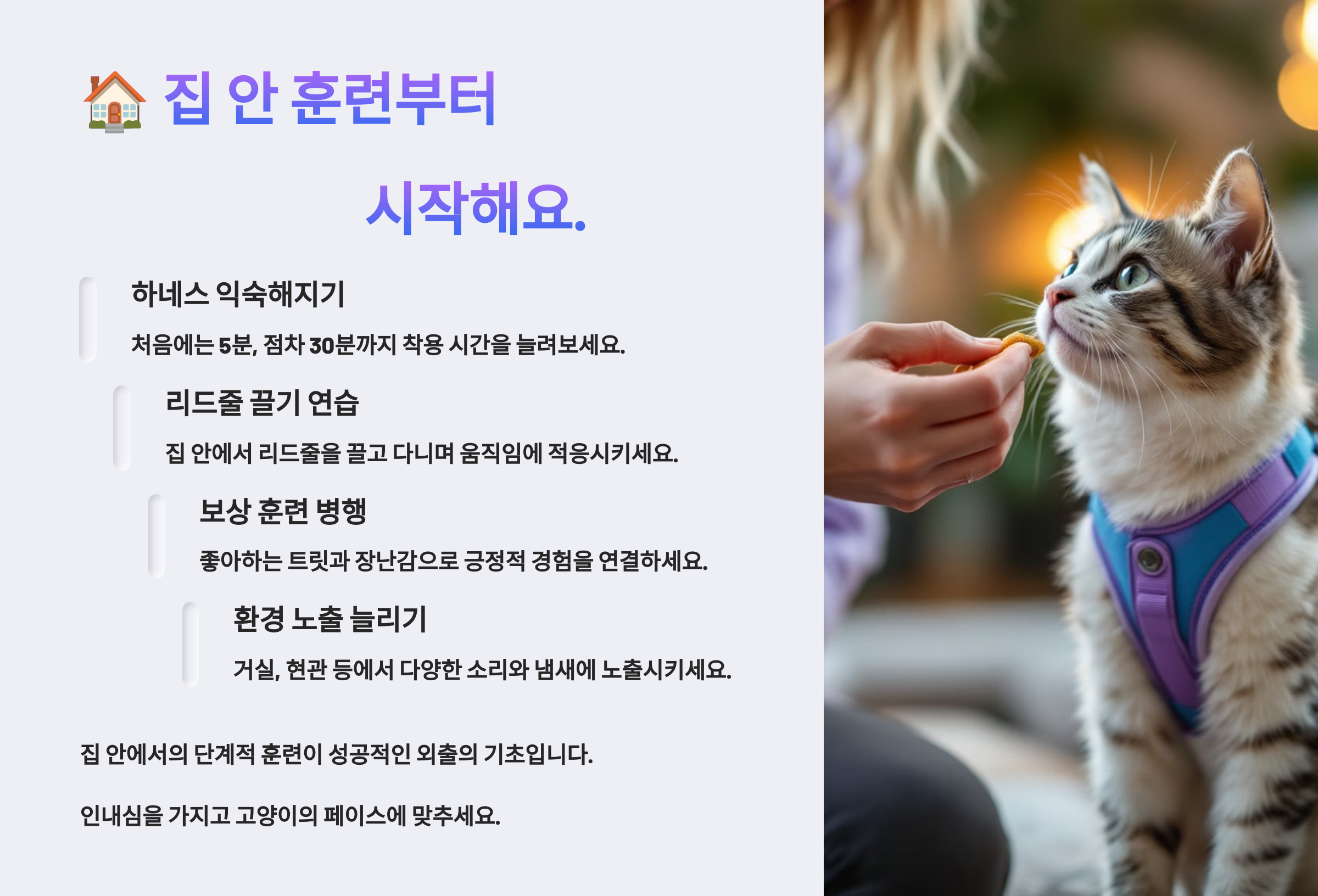 처음엔 하네스를 입히는 것조차 힘들 수 있어요. 실내에서 걷는 것도 어려워 보일 수 있죠. 하지만 제가 생각했을 때, 이런 과정을 함께 겪으며 하나씩 익숙해지는 시간이 바로 고양이와의 신뢰를 쌓는 소중한 순간이에요. 서두르지 않고 즐기듯 훈련해보세요.