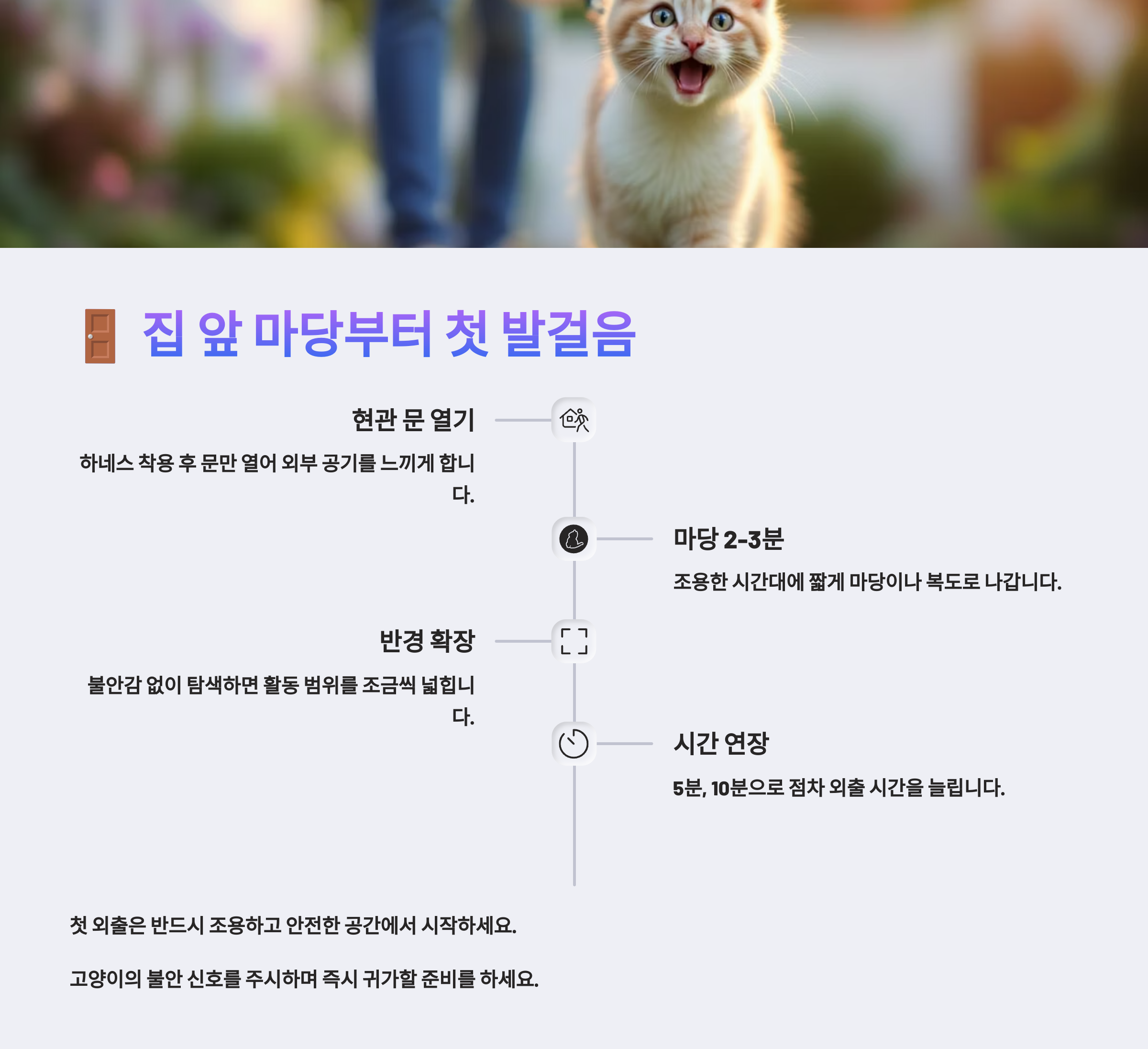 고양이가 하네스에 익숙해졌다면 이제 실외로 나갈 준비를 할 수 있어요. 하지만 절대 바로 큰 공원이나 낯선 장소로 데려가면 안 돼요. 첫 발걸음은 집 앞 마당이나 베란다, 현관 앞처럼 아주 익숙한 공간에서 시작해야 해요.