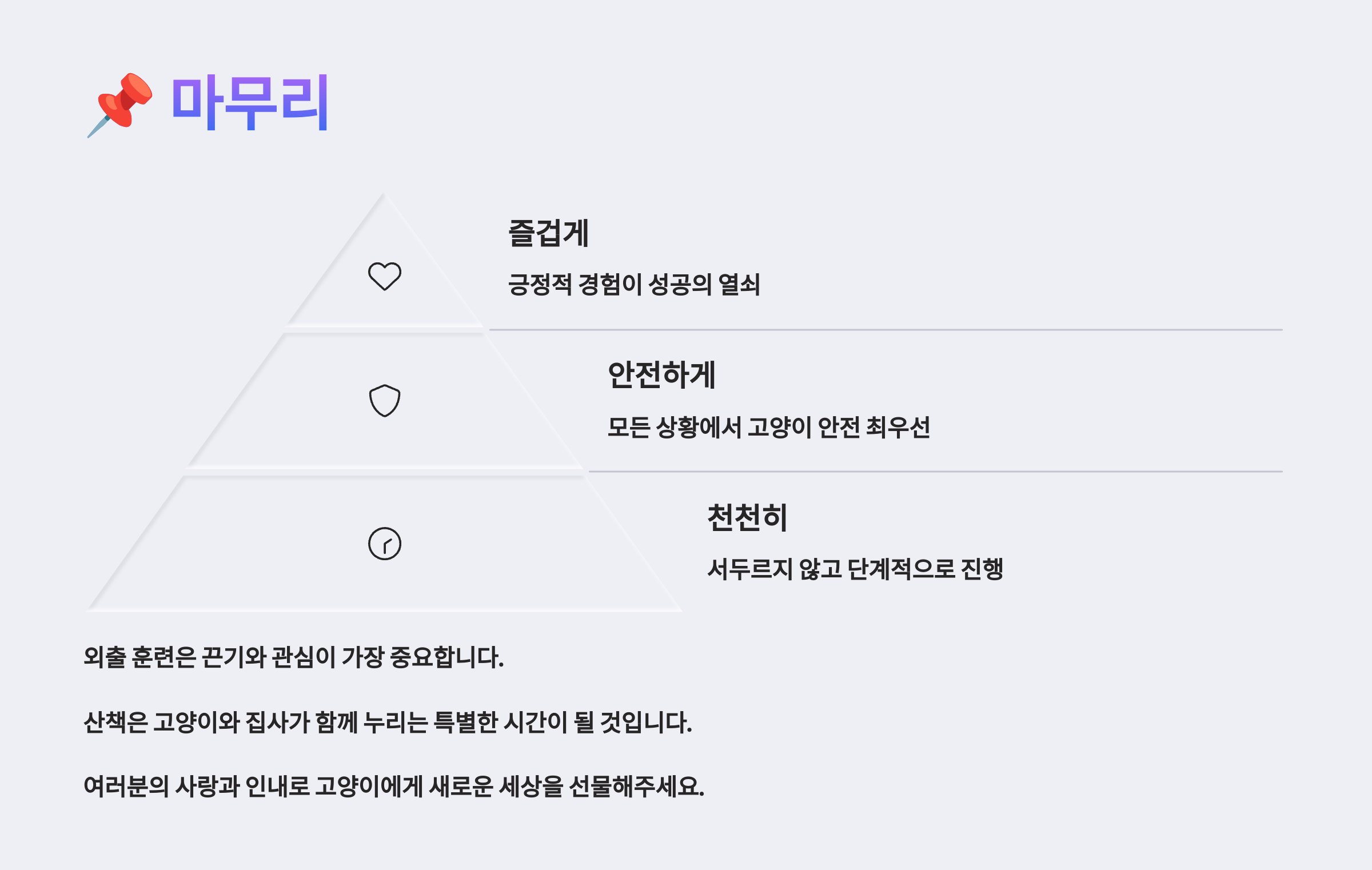 이제 준비물은 다 챙기셨죠? 그럼 본격적으로 훈련을 시작해볼게요. 다음은 🏠 집 안 훈련부터 시작해요 섹션에서 실내 적응 훈련법을 안내해드릴게요!