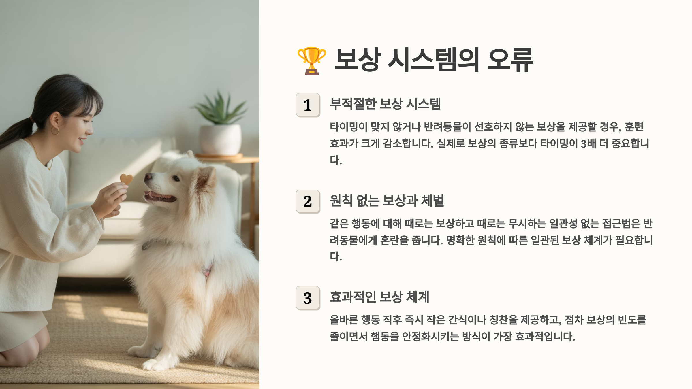 | 긍정 강화 | 행동 직후 1-3초 | 명확한 연결 학습 |