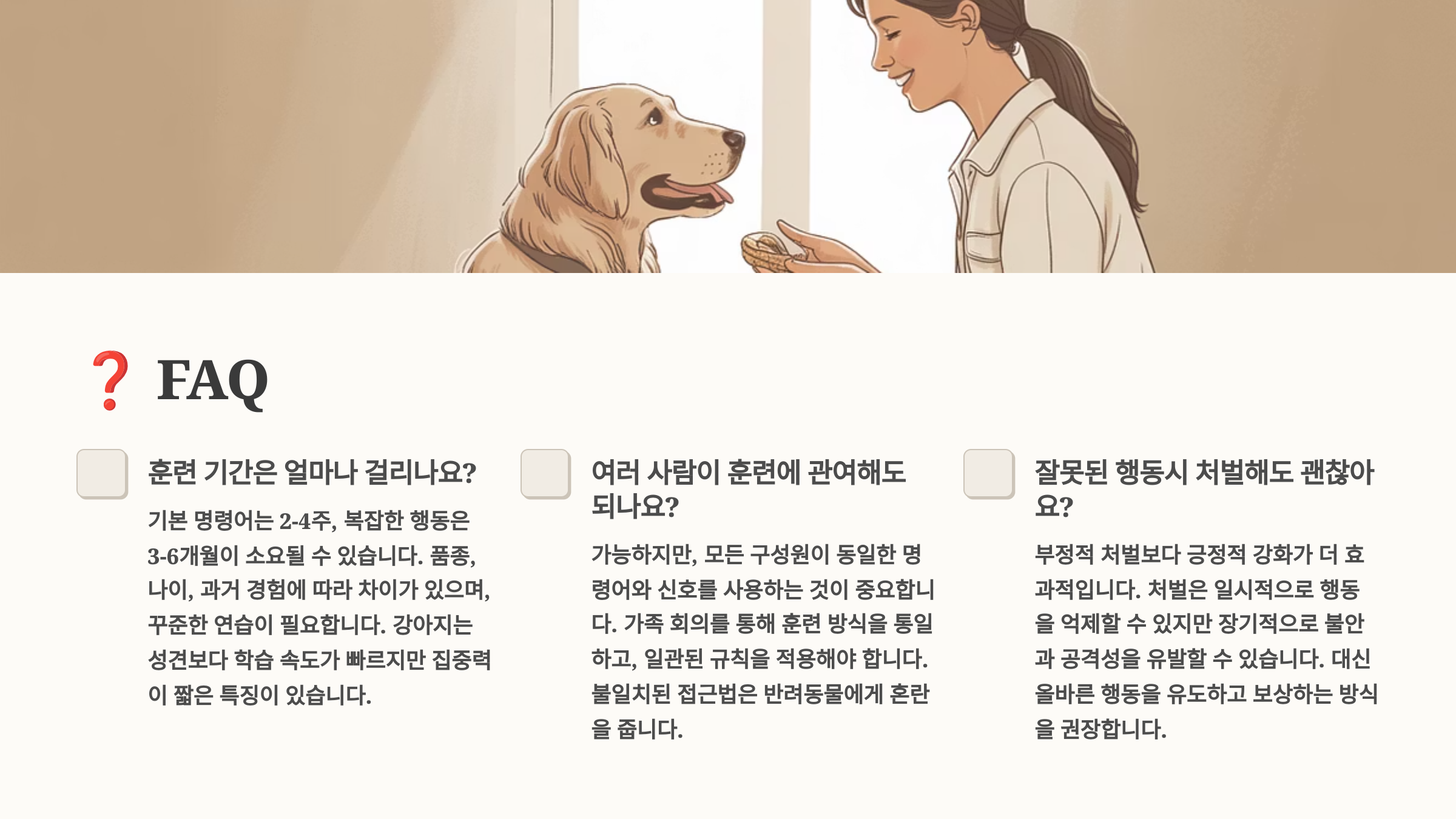 A9. 네, 체벌은 절대 권하지 않아요. 두려움과 불신을 만들고, 공격성을 유발할 수 있어요. 긍정 강화 훈련이 훨씬 효과적이고 안전해요. 원하는 행동을 보상하는 것이 원하지 않는 행동을 처벌하는 것보다 효과적이랍니다.