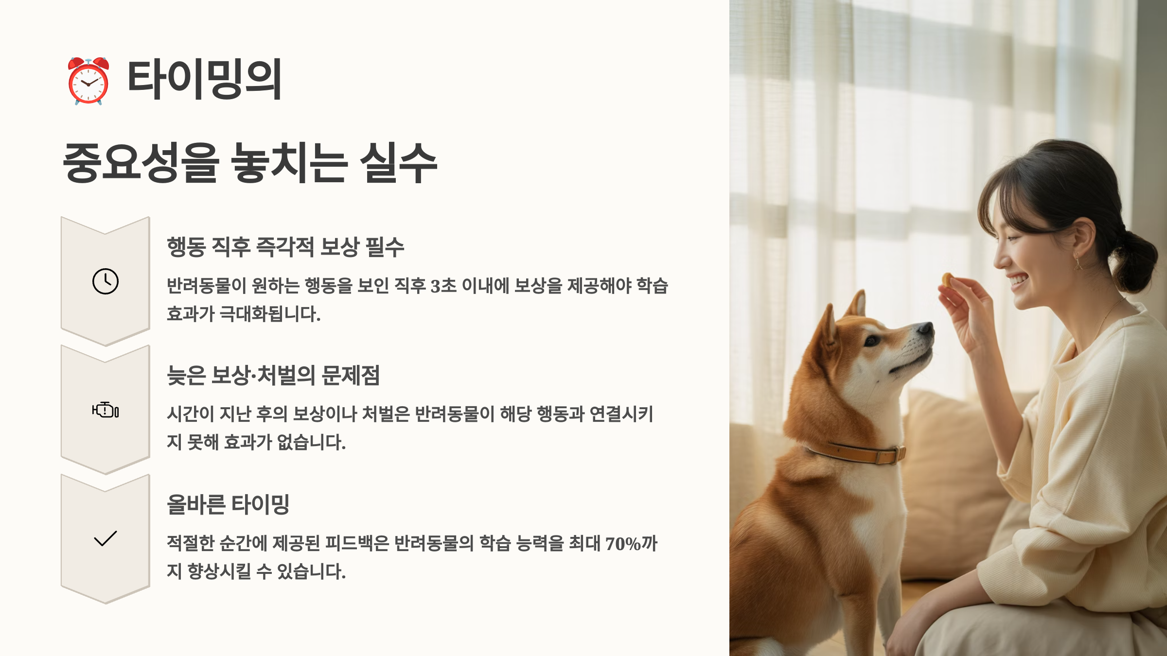 훈련에서 타이밍은 성공과 실패를 가르는 결정적인 요소예요. 반려동물은 인간과 달리 과거의 행동을 연결해서 생각하지 못해요. 그래서 보상이나 교정은 행동이 일어난 직후 3초 이내에 이루어져야 효과적이랍니다. 많은 보호자들이 이 골든타임을 놓쳐서 훈련에 실패하곤 해요.