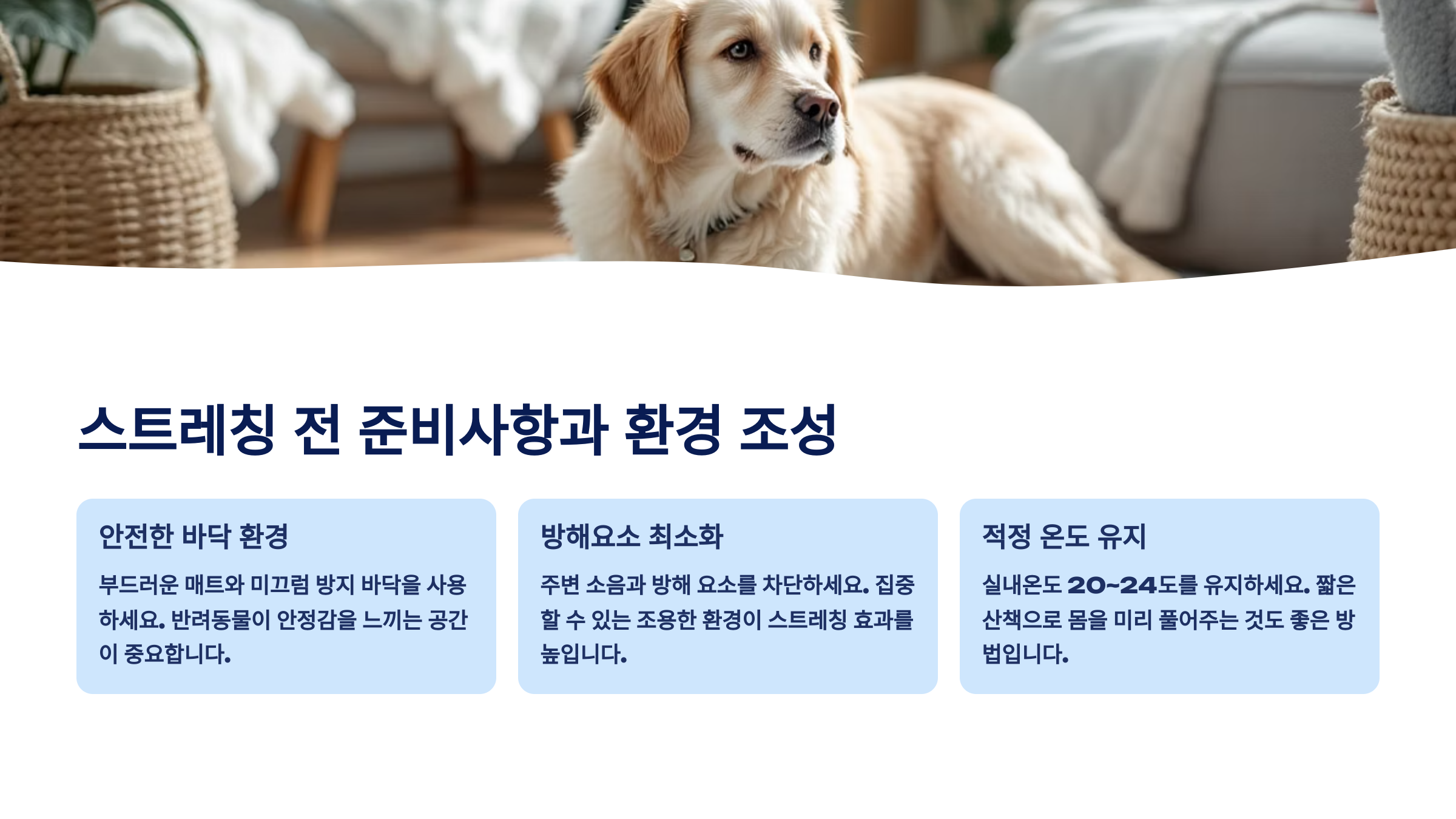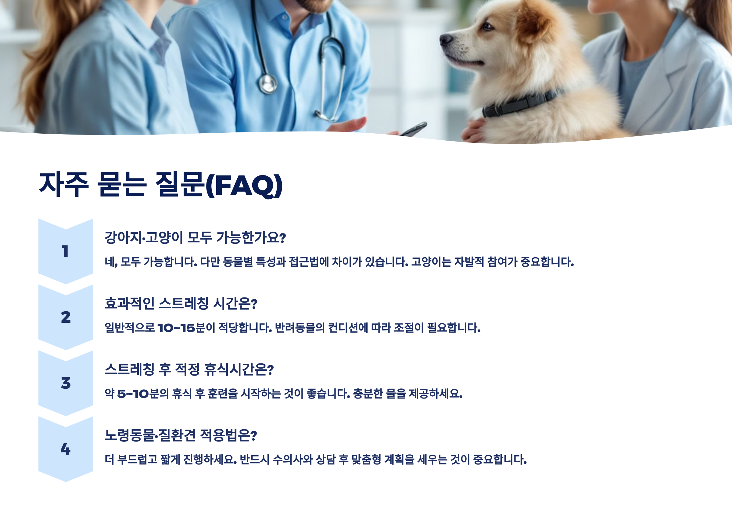 기존 질환이 있는 반려동물의 경우 더욱 주의가 필요해요. 관절염, 디스크, 근육 손상 등의 병력이 있다면 반드시 수의사와 상담 후 진행해야 해요. 또한 고령 반려동물의 경우 관절과 근육이 약해져 있을 수 있으니 더욱 부드럽고 조심스럽게 접근해야 해요. 어린 반려동물도 성장기라서 과도한 스트레칭은 피해야 해요.