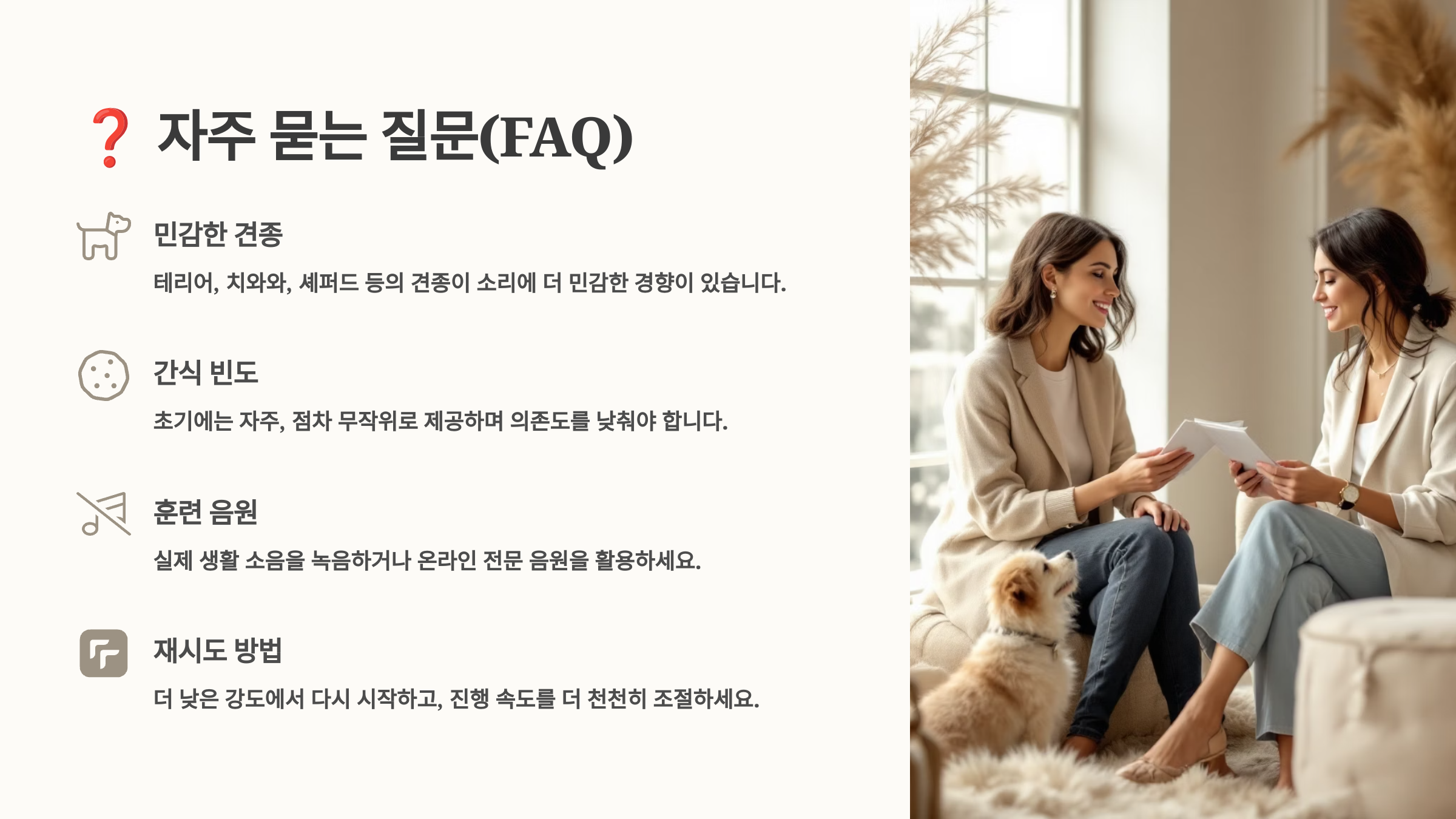 A5. 안타깝게도 즉효성 있는 완벽한 해결법은 없어요. 하지만 환경 개선(시야 차단, 백색소음 등)으로 당장의 문제는 줄일 수 있고, 동시에 훈련을 병행하면 점진적으로 개선될 거예요. 이웃분께 양해를 구하고 훈련 중임을 알려드리는 것도 좋은 방법이에요.