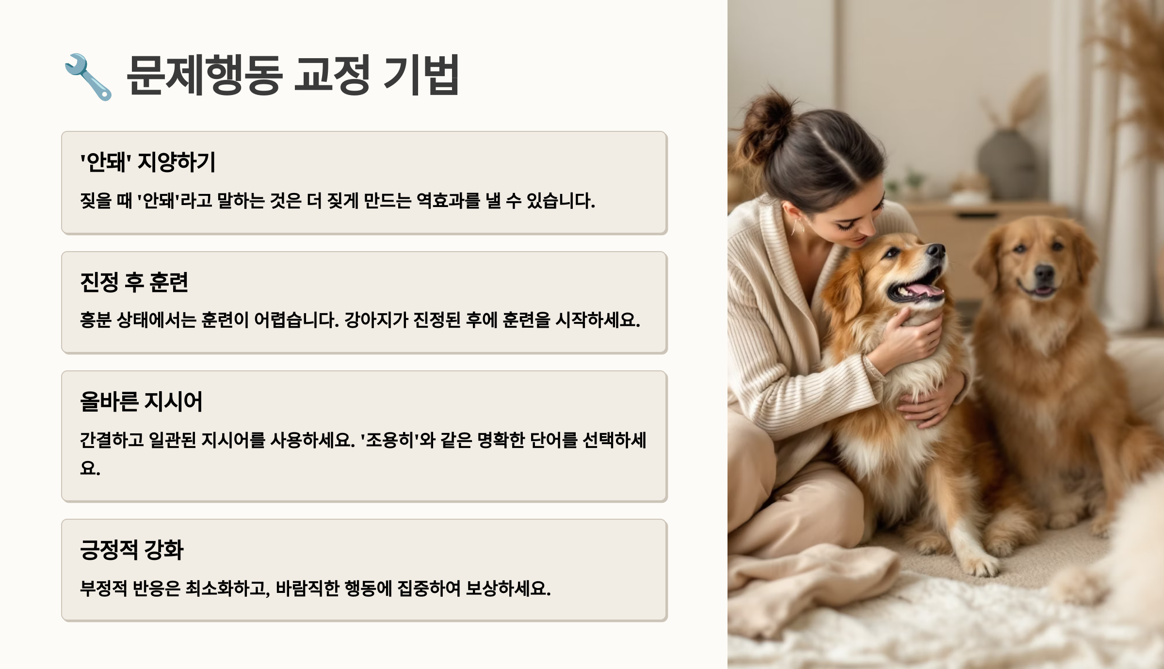 큰 소리로 꾸짖기 | 더 흥분시킴 | 차분한 명령어 |