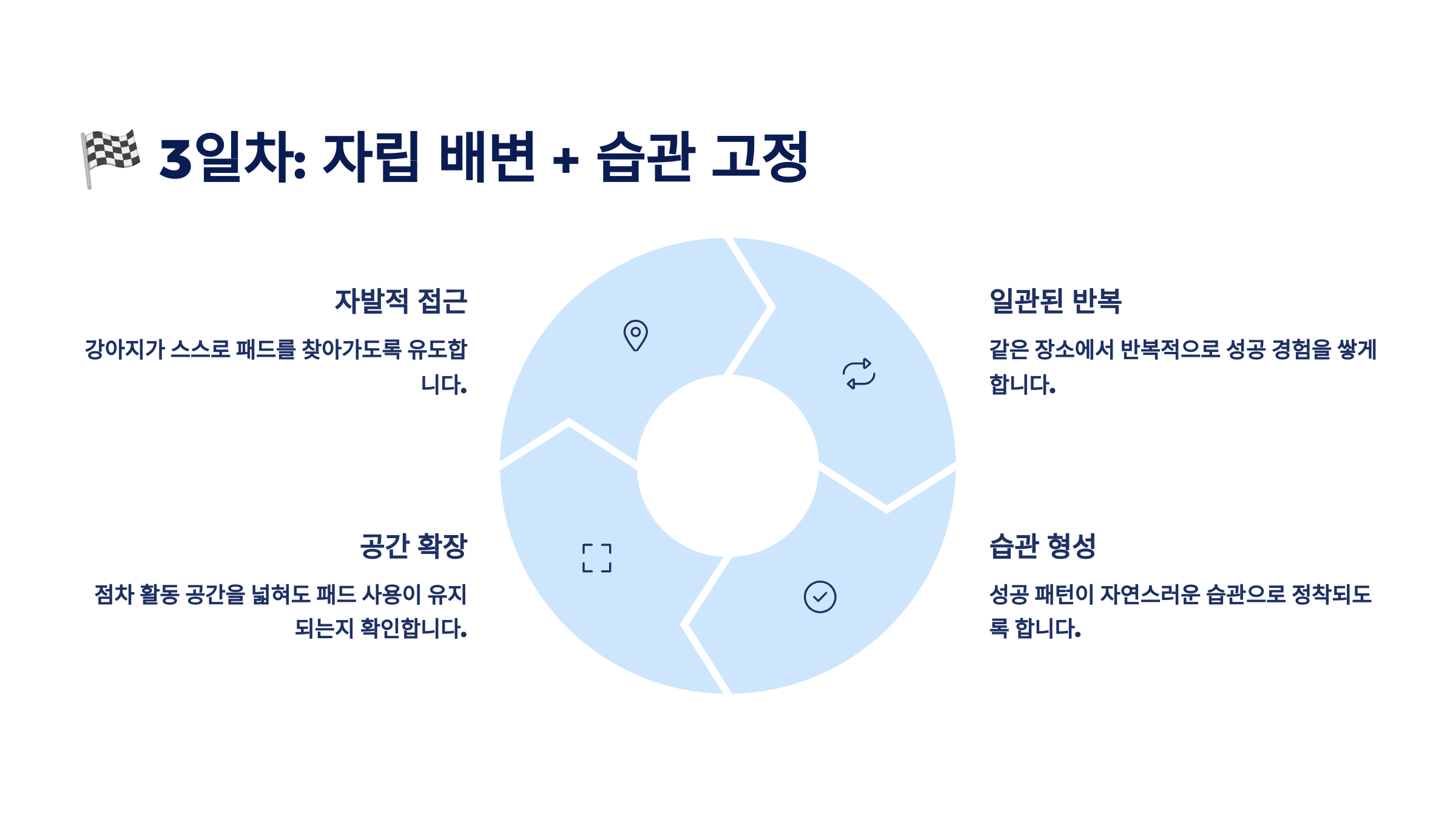 3일차는 자립 배변을 유도하고 습관으로 고정하는 시간이에요. 보호자의 개입 없이도 스스로 패드로 가게 만드는 게 목표죠. 작은 성공 하나하나를 반복하며 습관화→자동화로 연결하는 날이에요. 💫