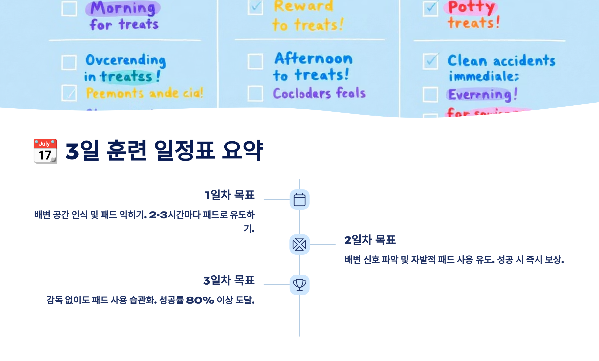 강아지 배변훈련을 3일 안에 끝내기 위해서는 하루마다 정확한 목표와 루틴이 필요해요. 막연히 “오늘도 패드 위에서 하게 하자”가 아니라 단계별 훈련 목표 설정이 있어야 성공률이 확 올라가요! 🎯
