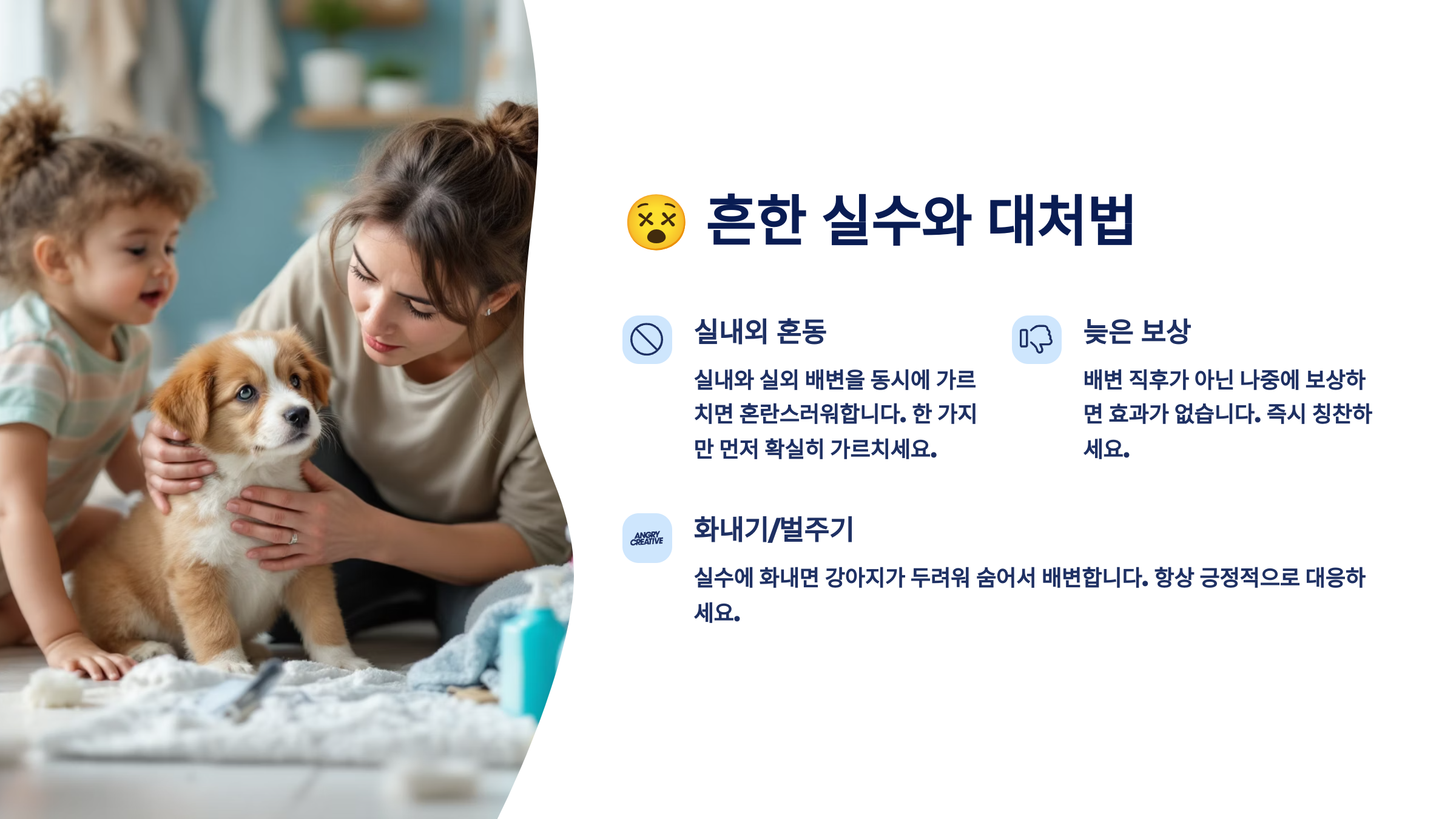 첫 번째 실수는 배변 직후에 혼내기예요. 강아지는 “싸서 혼나는 거야”가 아니라 “보호자가 갑자기 화낸다”고만 느껴요. 이러면 배변을 참거나 숨겨버리는 행동으로 이어질 수 있어요. 😔
