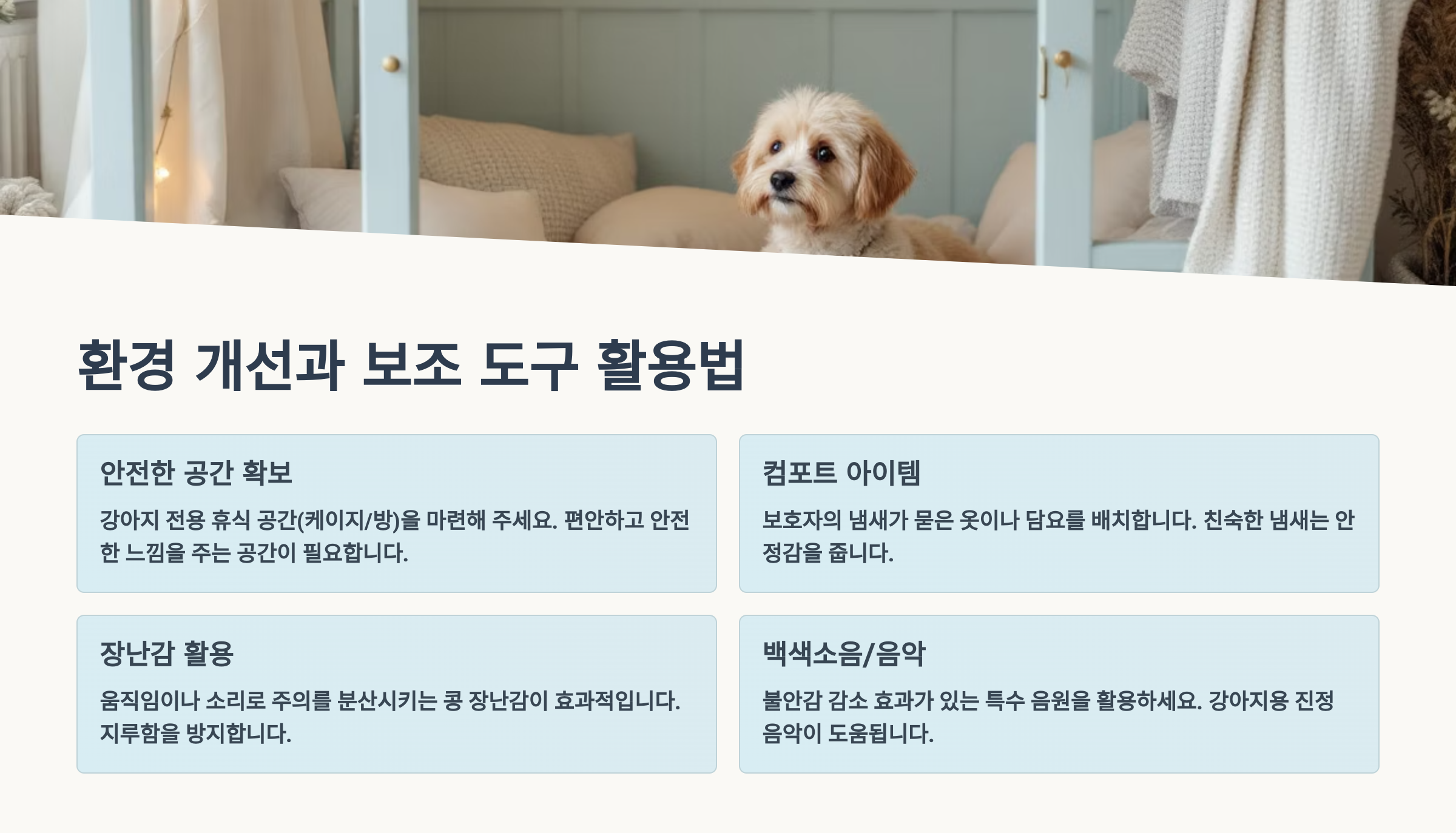 내가 생각했을 때 가장 중요한 건 강아지의 마음을 이해하는 것이에요. 강아지에게 주인은 세상 전부이고 안전지대이기 때문에 갑작스럽게 혼자 남겨지면 극도의 불안감을 느끼게 되죠. 이런 감정적 배경을 이해하고 강아지의 입장에서 접근해야 효과적인 해결책을 찾을 수 있어요. 이 가이드에서는 행동학적 원리에 기반한 실용적인 훈련법부터 환경 개선, 전문가 솔루션까지 단계별로 상세히 안내해드릴게요.