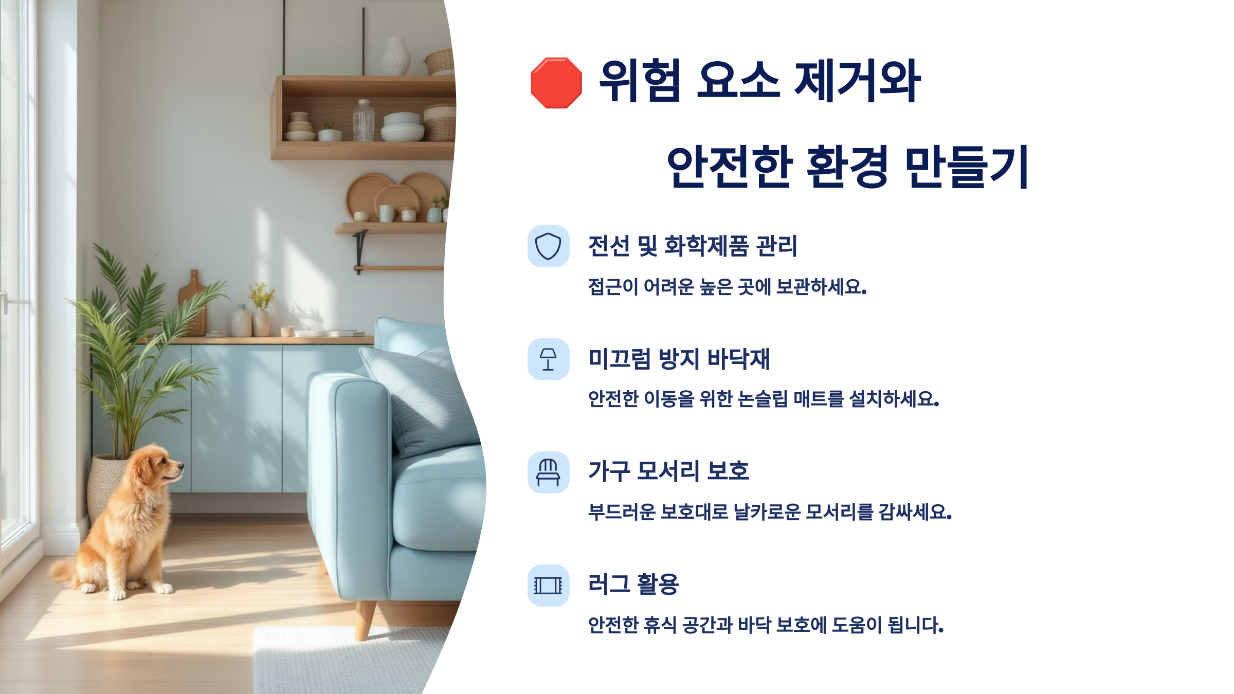 공간 분리만 잘해도 훈련 성공률이 확 올라가요. 다음 섹션에서는 이 공간을 더욱 ‘안전하게’ 만드는 방법을 알려드릴게요. 바로 🛑 위험 요소 제거와 안전한 환경 만들기입니다! 🧯