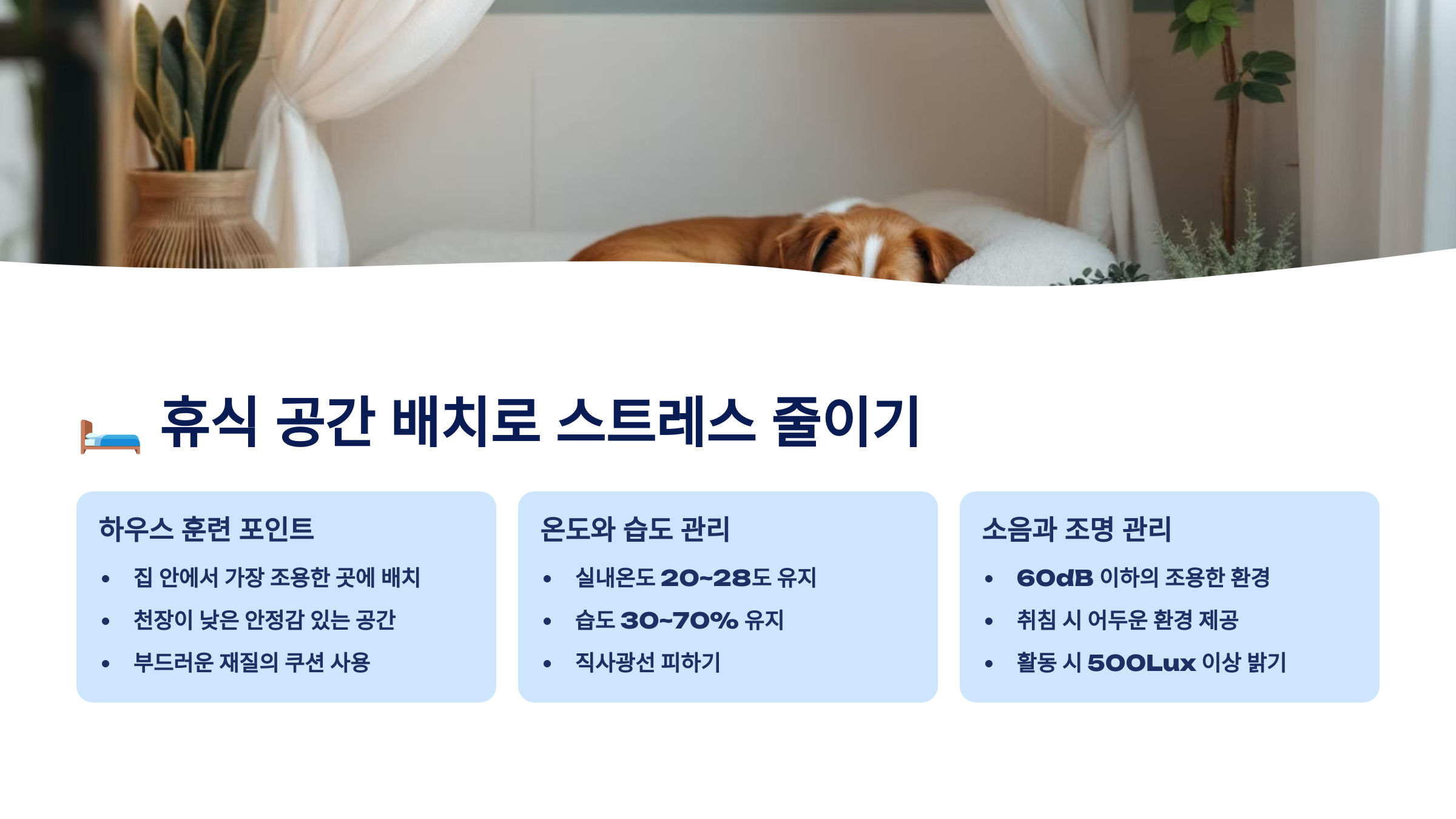 반려동물의 휴식 공간은 단순히 잠만 자는 곳이 아니라 심리적 안정감을 제공하는 핵심 공간이에요. 제대로 된 휴식이 있어야 다음날 훈련도 잘 따라오고, 불안 행동도 줄어든답니다. 🧸