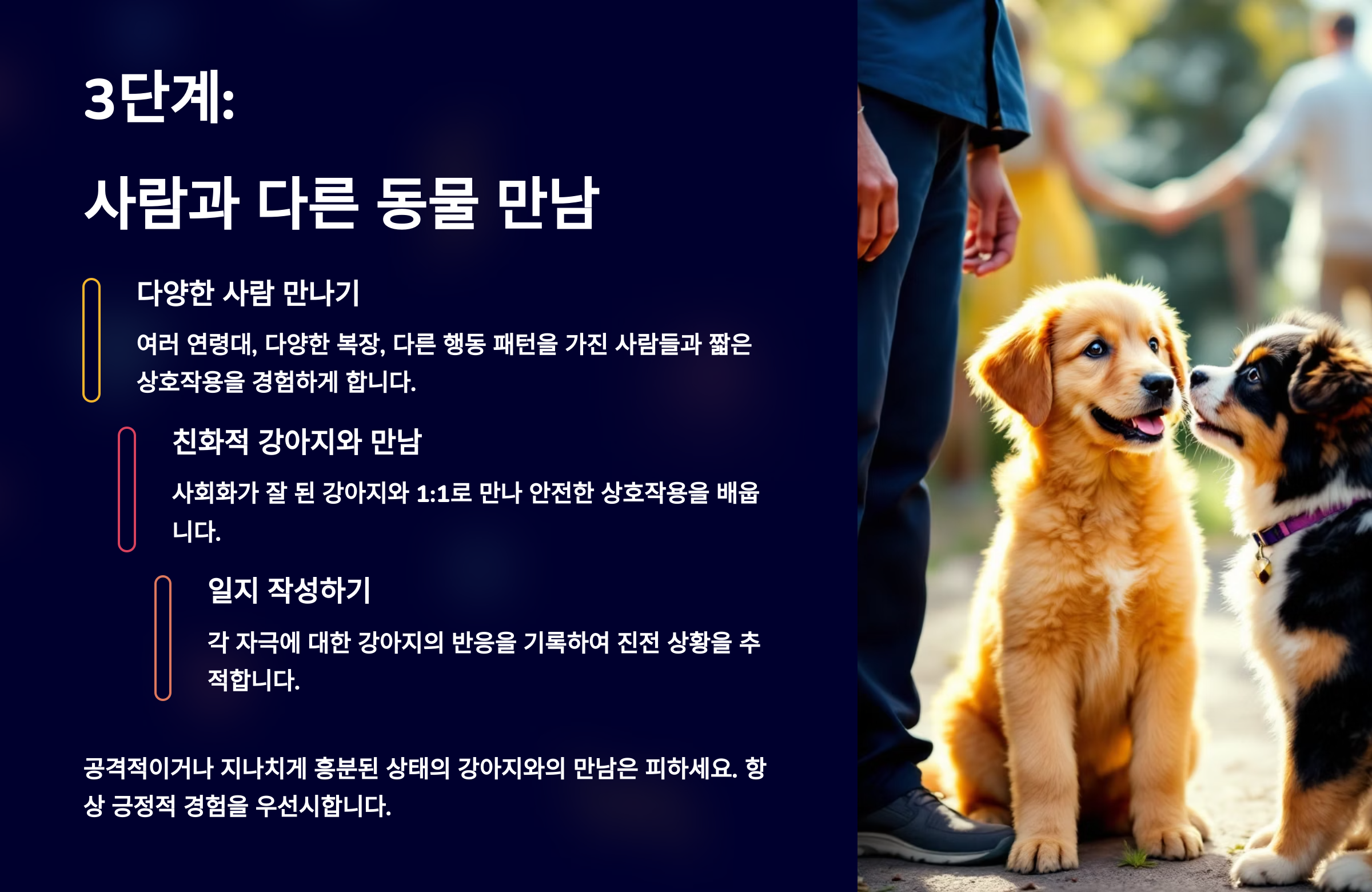 다음은 사회화 훈련의 핵심, 사람과 다른 동물과의 만남을 다루는 3단계 훈련을 알려드릴게요! 🐕👫