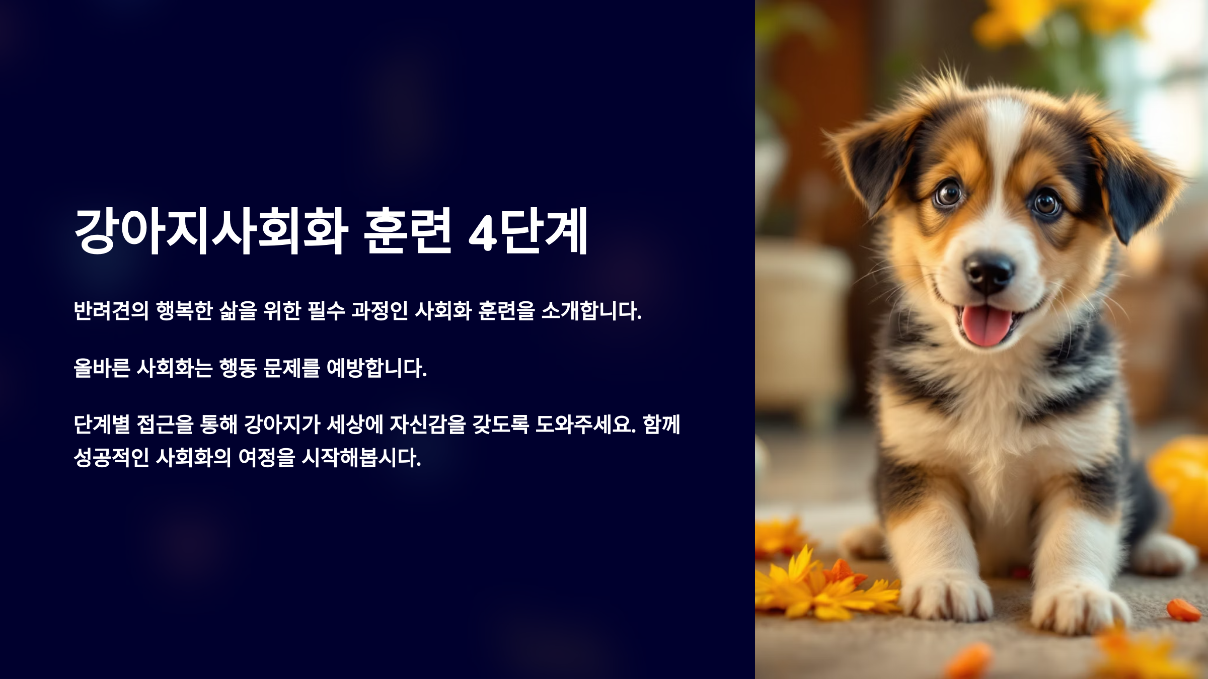 | 정의 | 강아지가 다양한 환경과 자극에 익숙해지도록 도와주는 교육 |