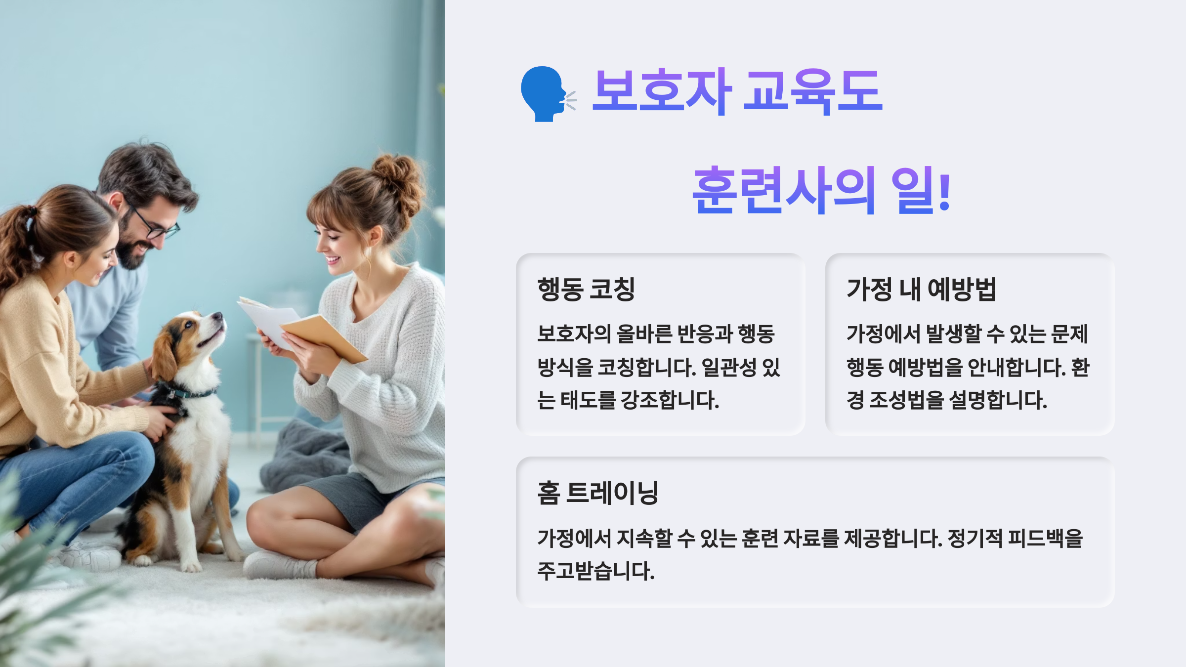 보호자 교육은 단순한 훈련 설명이 아니라 반려동물과 보호자가 함께 성장하는 과정이에요. 훈련사는 이 관계를 더 단단히 만들 수 있도록 돕는 조력자이자 통역사 같은 역할을 해요. 🧏♂️💬