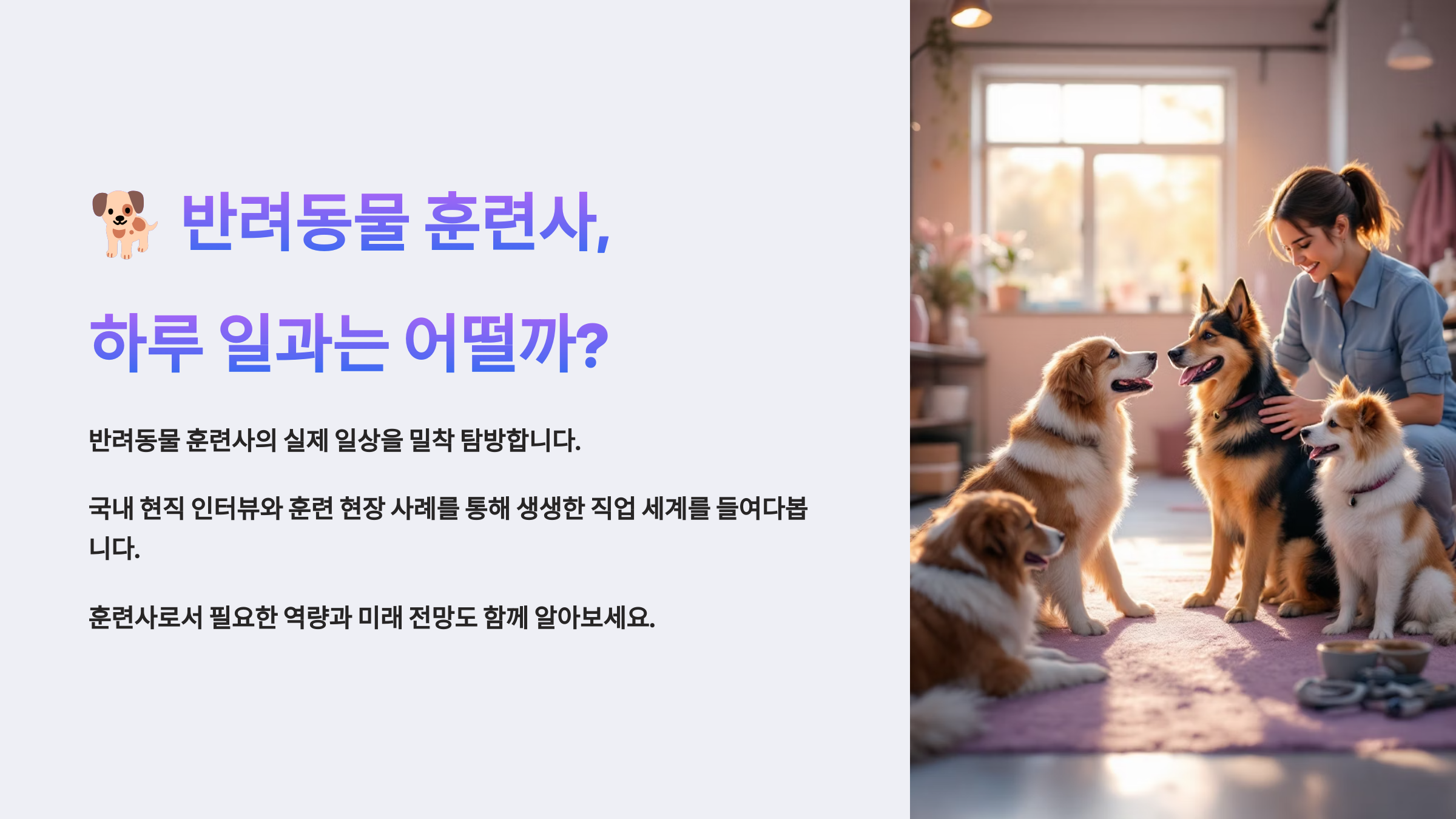 내가 생각했을 때, 훈련사라는 직업은 세상에서 가장 조용한 대화를 매일 이어가는 사람 같아요. 말 없는 동물들과 눈으로 대화하고, 몸짓으로 이해하고, 그 마음을 보호자에게 전해주는 통역사 같아요. 🐾🗣️