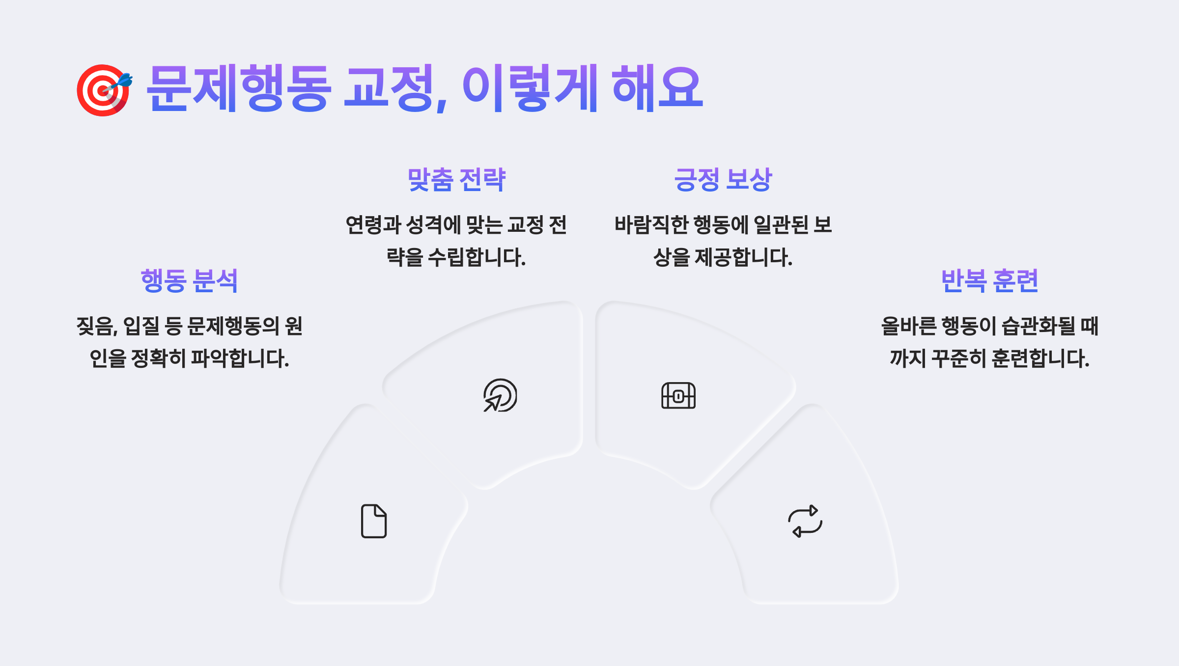 A2. 문제 행동의 종류와 반려동물의 성향에 따라 달라요. 보통 기초 훈련은 3~5회, 행동 교정은 4~8주 이상 걸릴 수 있어요.
